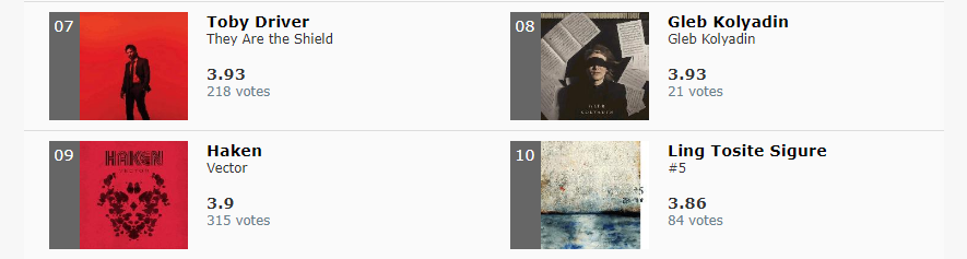my invitation to publish our lists is mainly intended to bring out the differences that exist between us in order to later verify if the albums in question are valid and had not been taken into account or if they are far from our musical preferences ... it remains however the fact that having to make a selection of only 10 albums, many excellent albums remain out ... Mike if you had prepared the list you could publish it |