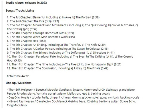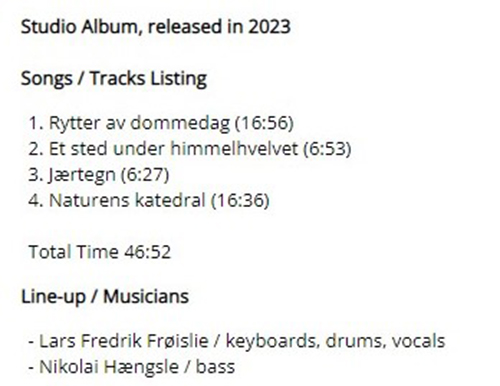 Attachment 1732 ABOUT LARS FREDRIK FRØISLIE ...from Prog Archives.com Lars Fredrik Frøislie biography Lars Fredrik FRØISLIE is the keyboard player of the band WOBBLER. He has worked with other Norwegian bands (WHITE WILLOW, TUSMØRKE). He also plays the drums and sings in Norwegian. "Fire Fortellinger" is his first solo album made alone during the pandemic. The music is without surprise keyboard-driven symphonic prog with 2 epic tracks of more than 16 minutes. Attachment 1735 Hi friends 2023 Work in Progress..ive These are my best tracks of 2023 Track Title-Group or Artist-Album I'm Done with You-RIVERSIDE-ID.ENTITY Life Lines-SUNCHILD-Exotic Creatures and a Stolen Dream Scanning The Dark Horizon-JOHN IRVINE-Scanning The Dark Horizon Memories in a Box-SINGLE CELLED ORGANISM-EVENT HORIZON To_find_the_light_part_two-GREAT WIDE NOTHING-Hymns for Hungry Spirits, Vol. II Ghosts From The Future-OVERHEAD-Telepathic Minds (Disc 1) King_of_the_world-RPWL-Crime Scene(Disc 1) No Man's Land-TNNE-LIFE 3.0 Mysterious Forest, Pt. 1-KARFAGEN-Passage to the Forest of Mysterious Something New-MARTIN MILLER-Maze of My Mind Kill_the_sun_and_the_moon_and_the_stars-THE BLACK CAT'S EYE-The Empty Space Between A Seamount And Shock-Headed Julia Gargantuan.(Part One)-AMPLIFIER-Hologram The Beauty and the Least-MYSTERY-Redemption Scratches-INNER PROSPEKT-Canvas Three All Connected-YES-Mirror to the sky Summer Lies Beyond-COMEDY OF ERRORS-THRENODY FOR A DEAD QUEEN The Sacred Law of Retribution-TRITOP-RISE OF KASSANDRA Ingravita-BUHO ERMITANO-IMPLOSIONES Danger-ELOY-ECHOES FROM THE PAST Naturens katedral-LARS FREDRIK FRØISLIE-FIRE FORTELLINGER Attachment 1733 Attachment 1734 Naturens katedral-LARS FREDRIK FRØISLIE https://larsfredrikfroislie.bandcamp...urens-katedral GOOD LISTENING |