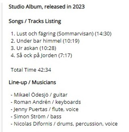 Attachment 1736 ABOUT AGUSA ...from Prog Archives.com Agusa biography Formed in Malmö, Sweden in 2013 AGUSA is a new prog quartet, initially comprised of Tobias Pettersson (bass), guitarist Mikael Ödesjö, drummer Dag Strömkvist and finally Jonas Berge on the organ. Some of them are also known from collaborating with bands like Sveriges Kommuner & Landsting, Kama Loka and Hoofoot. For the first time the musicians came together in early 2013. During the following summer they went out to the countryside in order to celebrate some jam sessions. The place is called Agusa, and that's why the band name finally established. In autumn they entered the studio to record their debut 'Högtid', which was released early 2014 on Transubstans Records and Kommun 2. Five authentic retro 70's progressive tunes are given, featuring dinstinctive organ work and a proper psychedelic fundament in the vein of Moonwagon, Hypnos69 and Astra. After a handful of gigs during the winter, Dag Strömkvist decided to leave and to travel around India for a while. The band auditioned a number of drummers, and eventually asked Tim Wallander from Magic Jove to join. Attachment 1739 Hi friends 2023 Work in Progress..ive These are my best tracks of 2023 Track Title-Group or Artist-Album I'm Done with You-RIVERSIDE-ID.ENTITY Life Lines-SUNCHILD-Exotic Creatures and a Stolen Dream Scanning The Dark Horizon-JOHN IRVINE-Scanning The Dark Horizon Memories in a Box-SINGLE CELLED ORGANISM-EVENT HORIZON To_find_the_light_part_two-GREAT WIDE NOTHING-Hymns for Hungry Spirits, Vol. II Ghosts From The Future-OVERHEAD-Telepathic Minds (Disc 1) King_of_the_world-RPWL-Crime Scene(Disc 1) No Man's Land-TNNE-LIFE 3.0 Mysterious Forest, Pt. 1-KARFAGEN-Passage to the Forest of Mysterious Something New-MARTIN MILLER-Maze of My Mind Kill_the_sun_and_the_moon_and_the_stars-THE BLACK CAT'S EYE-The Empty Space Between A Seamount And Shock-Headed Julia Gargantuan.(Part One)-AMPLIFIER-Hologram The Beauty and the Least-MYSTERY-Redemption Scratches-INNER PROSPEKT-Canvas Three All Connected-YES-Mirror to the sky Summer Lies Beyond-COMEDY OF ERRORS-THRENODY FOR A DEAD QUEEN The Sacred Law of Retribution-TRITOP-RISE OF KASSANDRA Ingravita-BUHO ERMITANO-IMPLOSIONES Danger-ELOY-ECHOES FROM THE PAST Naturens katedral-LARS FREDRIK FRØISLIE-FIRE FORTELLINGER Ur askan-AGUSA-PRIMA MATERIA Attachment 1737 Attachment 1738 Ur askan-AGUSA https://www.youtube.com/watch?v=2zuq...8BzQ7g&index=4 GOOD LISTENING |