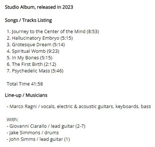 Attachment 1744 ABOUT MARCO RAGNI ...from Prog Archives.com Marco Ragni biography Born in 1969 (Rovigo, Italy) Marco Ragni is an Italian multi-instrumentalist, who has always been active in musical genres that include a psychedelic aspect. He started playing at age 6, in 1975, on a Farfisa keyboard he got as a present. His main influences for singing have been The Beatles, and his psychedelic influences start with the California hippie scene of the 1960s. In the late 1980's, he recorded two psychedelic pieces, Kaleido and Illumination, before joining the band Deshuesada, a psychedelic pop band that would keep him busy until 1998. Between 2000 an 2007 he played with Quartafila (later Heza) an recorded three albums with them, before playing one year with psychedelic funk rock band Mokers in 2008, resulting in the EP Don?t forget the music. From 2009 onward, Marco Ragni acts as a solo artist, composing and playing his own music, with varying guest musicians. Between 2010 and 2013 he released 5 studio albums and a live album through his own Crow records label. The live album contains recordings made with a band he established for touring, Velvet Cactus. In 2014 he released Mother from the Sun, his (first) psychedelic rock opera, which sounds as a modern Pink Floyd and a bit more. MARCO RAGNI forum topics / tours, shows & news Attachment 1747 Hi friends 2023 Work in Progress..ive These are my best tracks of 2023 Track Title-Group or Artist-Album I'm Done with You-RIVERSIDE-ID.ENTITY Life Lines-SUNCHILD-Exotic Creatures and a Stolen Dream Scanning The Dark Horizon-JOHN IRVINE-Scanning The Dark Horizon Memories in a Box-SINGLE CELLED ORGANISM-EVENT HORIZON To_find_the_light_part_two-GREAT WIDE NOTHING-Hymns for Hungry Spirits, Vol. II Ghosts From The Future-OVERHEAD-Telepathic Minds (Disc 1) King_of_the_world-RPWL-Crime Scene(Disc 1) No Man's Land-TNNE-LIFE 3.0 Mysterious Forest, Pt. 1-KARFAGEN-Passage to the Forest of Mysterious Something New-MARTIN MILLER-Maze of My Mind Kill_the_sun_and_the_moon_and_the_stars-THE BLACK CAT'S EYE-The Empty Space Between A Seamount And Shock-Headed Julia Gargantuan.(Part One)-AMPLIFIER-Hologram The Beauty and the Least-MYSTERY-Redemption Scratches-INNER PROSPEKT-Canvas Three All Connected-YES-Mirror to the sky Summer Lies Beyond-COMEDY OF ERRORS-THRENODY FOR A DEAD QUEEN The Sacred Law of Retribution-TRITOP-RISE OF KASSANDRA Ingravita-BUHO ERMITANO-IMPLOSIONES Danger-ELOY-ECHOES FROM THE PAST Naturens katedral-LARS FREDRIK FRØISLIE-FIRE FORTELLINGER Ur askan-AGUSA-PRIMA MATERIA The 11th Chapter: The Nine, including a) The Fire (pt II), b) A Nonagon in Eight -RING VAN MÖBIUS-Commissioned Works Pt II - Six Drops of Poison Journey to the Center of the Mind -MARCO RAGNI-HALLUCINATORY EMBRYO Attachment 1745 Attachment 1746 Journey to the Center of the Mind-MARCO RAGNI https://marcoragni.bandcamp.com/trac...er-of-the-mind the whole album contains good music GOOD LISTENING |