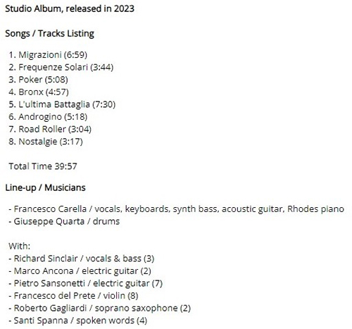 Attachment 1763 in the album STRINGS FROM THE EDGE OF SOUND there are many versions of previous songs rearranged with the orchestra which are very beautiful but since they are not songs from 2023 I don't take them into consideration for my list ABOUT KARMAMOI ...from official site In 2008 inspired by old and new progressive rock music, drummer and composer Daniele Giovannoni created KARMAMOI, giving life to a musical project that was able to express his idea of music. 2008 – 2011: The band performed in many shows in Italy and Europe, including the Jimi Festival in France and the Eurosonic Showcase Festival in the Netherlands. At the end of 2011, the band released its first album, simply called “KARMAMOI” (Crisalide). It is the band’s only album with Italian lyrics. 2013 – 2014: In December 2013 Karmamoi released their second album called “Odd Trip” (Crisalide). ”Odd Trip” was a huge step forward into the world of progressive rock. The band changed its sound and its way of writing music. It also saw a switch to English lyrics. The album received some great reviews, and in April 2014, Karmamoi performed at The Borderline in London supporting Curved Air, and at Zanzibar in Liverpool supporting Lifesigns. 2016 – 2017: Their third album “Silence Between Sounds” came out in October 2016,. This album took over two years to reach its release date due to changes in the band’s line up. Co-Produced by the esteemed Mark Tucker (Jethro Tull), Silence Between Sounds was critically acclaimed around the world, with some reviewers calling it one of the best progressive rock albums of 2016. Progsphere Magazine included Karmamoi in their list “One of 20 Best Italian Progressive Rock Bands.” In February 2017, Classic Rock Society Mag included “Plato’s Cave”, a song from Silence Between Sounds, in their progressive rock compilation “New Species 28”. The album also reached number two with both Progwereld and Progstreaming. In 2017 the band performed in Italy, the UK, and the Netherlands, returning to the UK in April 2018 to perform at the Winter’s End Festival in Chepstow 2018 : On 30th November 2018, Karmamoi released their fourth studio album, “The Day is Done” (Sonicbond). “The Day Is Done” features several special guests, including Colin Edwin, (Porcupine Tree) on bass and Geoff Leigh, on flute and saxophone (Steven Wilson, Ex-Wise Heads). Mark Tucker was yet again Co-Producer and sound engineer for the album. The band went on to perform at Danfest 8 (Leicester) and at “The Boston Music Room” ( London ). “The Day Is Done” received some stunning reviews and is considered one of the best prog albums of 2018. On 4th May 2019, Karmamoi performed at one of America’s most prestigious progressive rock festivals, ROSFEST, in Sarasota, Florida. On 29th June 2019 Karmamoi performed at “BLACK WATER PROG NIGHTS” in Milan and on 29th Sept 2019 they played at “PROGRESSIVAMENTE FREE FESTIVAL” in Rome 2021: Due to the lockdown imposed by the covid pandemic, in 2020 Karmamoi decided to dedicate their time to writing and recording a new album. Called ‘Room 101’, released on 28th May 2021, the album was inspired by George Orwell’s ‘1984’. It revisits some of the novel’s themes and concepts, adapting them to the present day and focusing on the human mind and its weaknesses. Produced by Daniele Giovannoni, and co-produced by Mark Tucker and Octavia Brown, ‘Room 101’ features the participation of some great musicians, including Adam Holzman (Miles Davis, Steven Wilson) and Steve Unruh (United Progressive Fraternity). Karmamoi made this album their first-ever vinyl release. 2022: In March 2022 Karmamoi released a new single called “WHICH DREAMS” From April 2022 Valerio Sgargi is the new singer of the Band. On 25th June Karmamoi performed as the open act of “IQ” at the “Legend Club” in Milan and on 29th July 2022, Karmamoi released the single TAMED SHADOWS 2023: The sixth studio album by KARMAMOI called STRINGS FROM THE EDGE OF SOUND will be out on 1st September 2023. On 3rd Sept 2023, the band will be performing at the most important Italian Prog Festival 2DAYS PROG+1 in Veruno Karmamoi are: Daniele Giovannoni (Drums, Keyboards and BV) Allesandro Massari (Guitars) Alessandro Cefalì (Bass) Valerio Sgargi ( Vocal and Keyboards) Attachment 1766 Hi friends 2023 Work in Progress..ive These are my best tracks of 2023 Track Title-Group or Artist-Album I'm Done with You-RIVERSIDE-ID.ENTITY Life Lines-SUNCHILD-Exotic Creatures and a Stolen Dream Scanning The Dark Horizon-JOHN IRVINE-Scanning The Dark Horizon Memories in a Box-SINGLE CELLED ORGANISM-EVENT HORIZON To_find_the_light_part_two-GREAT WIDE NOTHING-Hymns for Hungry Spirits, Vol. II Ghosts From The Future-OVERHEAD-Telepathic Minds (Disc 1) King_of_the_world-RPWL-Crime Scene(Disc 1) No Man's Land-TNNE-LIFE 3.0 Mysterious Forest, Pt. 1-KARFAGEN-Passage to the Forest of Mysterious Something New-MARTIN MILLER-Maze of My Mind Kill_the_sun_and_the_moon_and_the_stars-THE BLACK CAT'S EYE-The Empty Space Between A Seamount And Shock-Headed Julia Gargantuan.(Part One)-AMPLIFIER-Hologram The Beauty and the Least-MYSTERY-Redemption Scratches-INNER PROSPEKT-Canvas Three All Connected-YES-Mirror to the sky Summer Lies Beyond-COMEDY OF ERRORS-THRENODY FOR A DEAD QUEEN The Sacred Law of Retribution-TRITOP-RISE OF KASSANDRA Ingravita-BUHO ERMITANO-IMPLOSIONES Danger-ELOY-ECHOES FROM THE PAST Naturens katedral-LARS FREDRIK FRØISLIE-FIRE FORTELLINGER Ur askan-AGUSA-PRIMA MATERIA The 11th Chapter: The Nine, including a) The Fire (pt II), b) A Nonagon in Eight -RING VAN MÖBIUS-Commissioned Works Pt II - Six Drops of Poison Journey to the Center of the Mind -MARCO RAGNI-HALLUCINATORY EMBRYO Poker -I VIAGGI DI MADELEINE-TRA LUCE E OMBRA The Gathering-SKY PASSAGE-The Gathering Moving Through Tomorrow-SOUTHERN EMPIRE-Another World Tell Me-KARMAMOI-STRINGS FROM THE EDGE OF SOUND Attachment 1764 Attachment 1