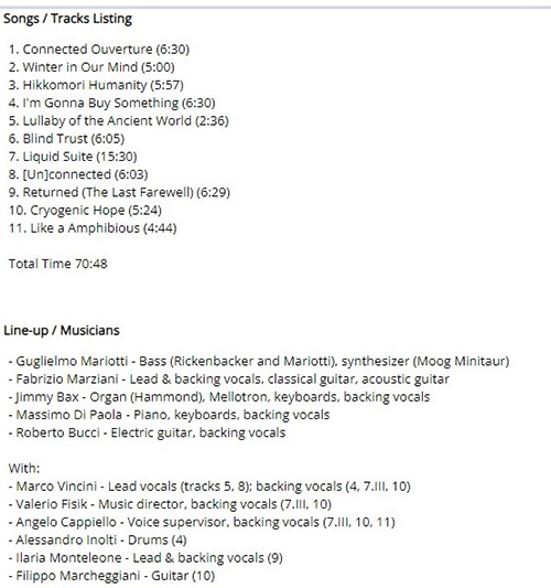 Attachment 1767 ABOUT LA BOCCA DELLA VERITA ...from progarchives.com La Bocca Della Verità biography Founded in Rome, Italy in 2001 LA BOCCA DELLA VERITÀ were formed with the purpose of reviving the progressive rock music of the seventies (especially of their influences PINK FLOYD, PREMIATA FORNERIA MARCONI, GENESIS, BANCO DEL MUTUO SOCCORSO, EMERSON, LAKE & PALMER and LE ORME) by means of performing covers of existing material from that era, which they initially did to very good effect. During this period the band enjoyed much public exposure, including concerts, cultural events and seminars on progressive rock music, but since 2004 the group has moved away from performing covers to devote themselves entirely to creating their first album of original compositions, `Avenoth'. A concept album consisting of a long suite of almost 78 minutes in length unsurprisingly influenced by the above mentioned artists, the keyboard dominated `Avenoth' features an enviable group-vocal richness that is perfectly balanced with lengthy and constant instrumental passages of various moods and changing atmospheres. Along with the orchestral grandiosity of the NEW TROLLS and a modern spin perhaps in the style of LOGOS, their music holds all the right ingredients for those who appreciate 70's prog brought up to date, and `Avenoth' is one of the standout Italian progressive releases of 2016! Biography by Michael Hodgson (Aussie-Byrd-Brother) Attachment 1770 Hi friends 2023 Work in Progress..ive These are my best tracks of 2023 Track Title-Group or Artist-Album I'm Done with You-RIVERSIDE-ID.ENTITY Life Lines-SUNCHILD-Exotic Creatures and a Stolen Dream Scanning The Dark Horizon-JOHN IRVINE-Scanning The Dark Horizon Memories in a Box-SINGLE CELLED ORGANISM-EVENT HORIZON To_find_the_light_part_two-GREAT WIDE NOTHING-Hymns for Hungry Spirits, Vol. II Ghosts From The Future-OVERHEAD-Telepathic Minds (Disc 1) King_of_the_world-RPWL-Crime Scene(Disc 1) No Man's Land-TNNE-LIFE 3.0 Mysterious Forest, Pt. 1-KARFAGEN-Passage to the Forest of Mysterious Something New-MARTIN MILLER-Maze of My Mind Kill_the_sun_and_the_moon_and_the_stars-THE BLACK CAT'S EYE-The Empty Space Between A Seamount And Shock-Headed Julia Gargantuan.(Part One)-AMPLIFIER-Hologram The Beauty and the Least-MYSTERY-Redemption Scratches-INNER PROSPEKT-Canvas Three All Connected-YES-Mirror to the sky Summer Lies Beyond-COMEDY OF ERRORS-THRENODY FOR A DEAD QUEEN The Sacred Law of Retribution-TRITOP-RISE OF KASSANDRA Ingravita-BUHO ERMITANO-IMPLOSIONES Danger-ELOY-ECHOES FROM THE PAST Naturens katedral-LARS FREDRIK FRØISLIE-FIRE FORTELLINGER Ur askan-AGUSA-PRIMA MATERIA The 11th Chapter: The Nine, including a) The Fire (pt II), b) A Nonagon in Eight -RING VAN MÖBIUS-Commissioned Works Pt II - Six Drops of Poison Journey to the Center of the Mind -MARCO RAGNI-HALLUCINATORY EMBRYO Poker -I VIAGGI DI MADELEINE-TRA LUCE E OMBRA The Gathering-SKY PASSAGE-The Gathering Moving Through Tomorrow-SOUTHERN EMPIRE-Another World Tell Me-KARMAMOI-STRINGS FROM THE EDGE OF SOUND Liquid Suite-LA BOCCA DELLA VERITA-[Un]connected Attachment 1768 Attachment 1769 Liquid Suite-LA BOCCA DELLA VERITA https://altrockproductions.bandcamp....k/liquid-suite GOOD LISTENING |
