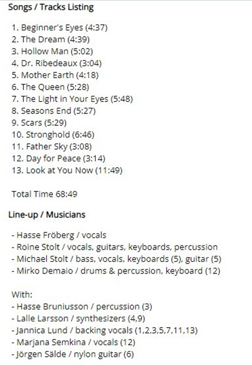 Attachment 1771 ABOUT THE FLOWER KINGS ...from progarchives.com The Flower Kings biography Founded in Uppsala, Sweden in 1994 - Hiatus between 2008-2012 It's hard to make a biography about THE FLOWER KINGS, being that there's so much to say about them, so any attempt of telling their history may seem insufficient. This essential Swedish group was born around 1993 as a power trio formed by Roine STOLT (Ex-KAIPA) in guitar and vocals, Jaime SALAZAR (Drums) and Hasse BRUNIUSSON (percussion), and ex-SAMLA MAMMAS MANNA, this lineup worked with Stolt in his solo album "The Flower King" with the participation of Hans Fröberg (Lead and Backing vocals) who would stay with them. Soon they decided to form a band using the name of the solo album so THE FLOWER KINGS was born, the keyboardist Tomas BODIN and Roine's brother Michael in the bass joined and the band was officially born. For 1995 they have their first release ready "Back in the World of Adventures" which impressed the critics very much for their closeness to the style of early bands such as Moody Blues, genesis, Jethro Tull etc, borrowing ideas but not music, so you can easily find their inspiration but a single chord copied, I personally liked the album but found it closer to Neo Prog than to Symphonic but this is only a stylistic precision that has no relation with the quality of the album. The next few years are prolific with few changes and they release "Retropolis" in 1996. Stardust we Are" in 1997 and "Flower Power" in 1998 with no great changes. In 1999 Michael Stolt leaves the band and is replaced by Jonas Reingold so the new formation for "Space Revolver" in the year 2000 also includes Ulf Wallander playing the Sax as a guest that remains for a long period with them. After "The Rainmaker" in 2001 Jaime Salazar leaves the band and the drums are taken by Zoltan Csörsz who stays in the band until the release of "Paradox Hotel" (2005) when is replaced by Marcus Liliequist. As most Swedish bands the quality of their music and the musicianship of their members is impeccable but don't expect the complexity of their most illustrious compatriots like Anglagard or the dark and almost religious atmosphere of Par Lindh Project (With whom Roine worked in Gothic Impressions), being that the music of THE FLOWER KINGS is a bit lighter but not inferior by any means. Attachment 1774 Hi friends 2023 Work in Progress..ive These are my best tracks of 2023 Track Title-Group or Artist-Album I'm Done with You-RIVERSIDE-ID.ENTITY Life Lines-SUNCHILD-Exotic Creatures and a Stolen Dream Scanning The Dark Horizon-JOHN IRVINE-Scanning The Dark Horizon Memories in a Box-SINGLE CELLED ORGANISM-EVENT HORIZON To_find_the_light_part_two-GREAT WIDE NOTHING-Hymns for Hungry Spirits, Vol. II Ghosts From The Future-OVERHEAD-Telepathic Minds (Disc 1) King_of_the_world-RPWL-Crime Scene(Disc 1) No Man's Land-TNNE-LIFE 3.0 Mysterious Forest, Pt. 1-KARFAGEN-Passage to the Forest of Mysterious Something New-MARTIN MILLER-Maze of My Mind Kill_the_sun_and_the_moon_and_the_stars-THE BLACK CAT'S EYE-The Empty Space Between A Seamount And Shock-Headed Julia Gargantuan.(Part One)-AMPLIFIER-Hologram The Beauty and the Least-MYSTERY-Redemption Scratches-INNER PROSPEKT-Canvas Three All Connected-YES-Mirror to the sky Summer Lies Beyond-COMEDY OF ERRORS-THRENODY FOR A DEAD QUEEN The Sacred Law of Retribution-TRITOP-RISE OF KASSANDRA Ingravita-BUHO ERMITANO-IMPLOSIONES Danger-ELOY-ECHOES FROM THE PAST Naturens katedral-LARS FREDRIK FRØISLIE-FIRE FORTELLINGER Ur askan-AGUSA-PRIMA MATERIA The 11th Chapter: The Nine, including a) The Fire (pt II), b) A Nonagon in Eight -RING VAN MÖBIUS-Commissioned Works Pt II - Six Drops of Poison Journey to the Center of the Mind -MARCO RAGNI-HALLUCINATORY EMBRYO Poker -I VIAGGI DI MADELEINE-TRA LUCE E OMBRA The Gathering-SKY PASSAGE-The Gathering Moving Through Tomorrow-SOUTHERN EMPIRE-Another World Tell Me-KARMAMOI-STRINGS FROM THE EDGE OF SOUND Liquid Suite-LA BOCCA DELLA VERITA-[Un]connected Stronghold -THE FLOWER KINGS-LOOK AT YOU NOW Attachment 1772 Attachment 1773 Stronghold-THE FLOWER KINGS https://www.youtube.com/watch?v=gKNGE9cMUOE GOOD LISTENING |