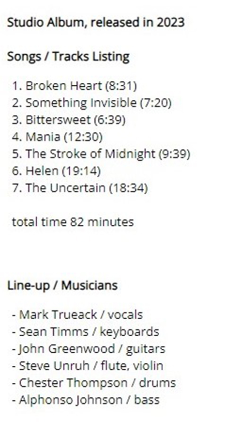 Attachment 1777 ABOUT UNITOPIA ...from progarchives.com Unitopia biography Active since 1996 - Disbanded in January 2014 - Reformed in 2021 Unitopia is the rare case of prog from "down under". The band was formed by Mark Trueack (vocals) and Sean Timms (keyboard, guitar) after they were introduced by a mutual friend who saw that the two had similar tastes in music and the story goes that as soon as Timms heard Trueack sing, he knew they had to do something together. They released their first album, "More Than A Dream" in 2005 after spending 8 years on the albums, and have since been working on material for their second album "The Garden", which was recently released after 3 years of writing, recording and mastering. The band's influences stretch all across the progressive scope and make for a very intriguing sound that has one foot in "retro"-70s style progressive while still being able to sound like other artists in the modern progressive scene. They have a rather large sound to them, which is no doubt helped by their 6-member roster (including Matt Williams (guitar), Monty Ruggiero (drums), Shireen Khemlani (bass) and Tim Irrang (percussion)). They mix a combination of Flower Kings-like symphonic qualities with the soul of Ladder-era Yes and Trueack's unique vocals to make the brunt of their sound. With the band's two first releases they have shown that they're an ambitious bunch. While the first album failed to make waves in the progressive community, their second album, The Garden has received critical praise in many prog circles, and as a double album with multiple epics, it certainly isn't one to be taken as "a flash in the pan". From here, one can only wonder what the band will do next. A promising new entrant into the "retro" scene which should turn the heads of those interested in hearing more modern symphonic prog with various influences. Attachment 1780 Hi friends 2023 Work in Progress..ive These are my best tracks of 2023 Track Title-Group or Artist-Album I'm Done with You-RIVERSIDE-ID.ENTITY Life Lines-SUNCHILD-Exotic Creatures and a Stolen Dream Scanning The Dark Horizon-JOHN IRVINE-Scanning The Dark Horizon Memories in a Box-SINGLE CELLED ORGANISM-EVENT HORIZON To_find_the_light_part_two-GREAT WIDE NOTHING-Hymns for Hungry Spirits, Vol. II Ghosts From The Future-OVERHEAD-Telepathic Minds (Disc 1) King_of_the_world-RPWL-Crime Scene(Disc 1) No Man's Land-TNNE-LIFE 3.0 Mysterious Forest, Pt. 1-KARFAGEN-Passage to the Forest of Mysterious Something New-MARTIN MILLER-Maze of My Mind Kill_the_sun_and_the_moon_and_the_stars-THE BLACK CAT'S EYE-The Empty Space Between A Seamount And Shock-Headed Julia Gargantuan.(Part One)-AMPLIFIER-Hologram The Beauty and the Least-MYSTERY-Redemption Scratches-INNER PROSPEKT-Canvas Three All Connected-YES-Mirror to the sky Summer Lies Beyond-COMEDY OF ERRORS-THRENODY FOR A DEAD QUEEN The Sacred Law of Retribution-TRITOP-RISE OF KASSANDRA Ingravita-BUHO ERMITANO-IMPLOSIONES Danger-ELOY-ECHOES FROM THE PAST Naturens katedral-LARS FREDRIK FRØISLIE-FIRE FORTELLINGER Ur askan-AGUSA-PRIMA MATERIA The 11th Chapter: The Nine, including a) The Fire (pt II), b) A Nonagon in Eight -RING VAN MÖBIUS-Commissioned Works Pt II - Six Drops of Poison Journey to the Center of the Mind -MARCO RAGNI-HALLUCINATORY EMBRYO Poker -I VIAGGI DI MADELEINE-TRA LUCE E OMBRA The Gathering-SKY PASSAGE-The Gathering Moving Through Tomorrow-SOUTHERN EMPIRE-Another World Tell Me-KARMAMOI-STRINGS FROM THE EDGE OF SOUND Liquid Suite-LA BOCCA DELLA VERITA-[Un]connected Stronghold -THE FLOWER KINGS-LOOK AT YOU NOW Helen-UNITOPIA-SEVEN CHAMBERS Attachment 1778 Attachment 1779 Helen-UNITOPIA https://unitopia.bandcamp.com/track/helen-2 GOOD LISTENING |