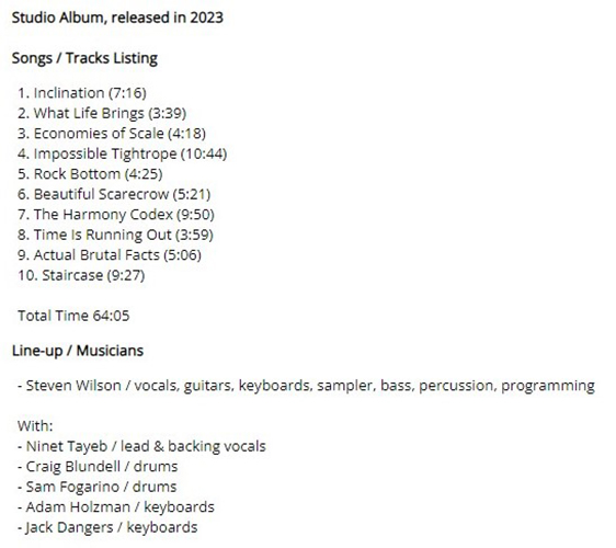 Attachment 1781 ABOUT STEVEN WILSON ...from progarchives.com Steven Wilson biography Steven John Wilson - Born 3 November 1967 (Kingston upon Thames, London, UK) STEVEN WILSON, perhaps most widely known for his role as the frontman for the popular act PORCUPINE TREE , is an artist from the UK who, through his various side projects, has spanned a vast number of musical ideas and concepts. Some of the styles he has been known to utilize are heavy prog, psychedelic, electronica, post-rock, ambient music, drone, metal, and art rock. Furthermore, WILSON is intensely focused on production values, dynamic mixing and mastering, and all other sorts of building albums that sound best in high-quality systems. In short, WILSON has always been an artist that appeals to audiophiles and fans of meticulously produced music. This shows up strongly in each of his bands and projects, but it plays even more of a role in his solo efforts. ...the news for 2023 is that Steven Wilson is back making good music.... after having hit rock bottom with the album THE FUTURE BITES which I consider it the worst while Steven Wilson considers it perhaps the best ..... but you can understand his yardstick if you know the character better and I through his interviews that I read I could understand that he created excellent music with Porcupine Tree and as a soloist but what he would like to create is very distant from the music he then composed in a genre that is very close to pop.. .. I hope that he leaves this dream of his in the drawer or that he composes this genre to be interpreted by others..... this is the presentation of the album with Steven's words from his official website Attachment 1785 Attachment 1786 Hi friends 2023 Work in Progress..ive These are my best tracks of 2023 Track Title-Group or Artist-Album I'm Done with You-RIVERSIDE-ID.ENTITY Life Lines-SUNCHILD-Exotic Creatures and a Stolen Dream Scanning The Dark Horizon-JOHN IRVINE-Scanning The Dark Horizon Memories in a Box-SINGLE CELLED ORGANISM-EVENT HORIZON To_find_the_light_part_two-GREAT WIDE NOTHING-Hymns for Hungry Spirits, Vol. II Ghosts From The Future-OVERHEAD-Telepathic Minds (Disc 1) King_of_the_world-RPWL-Crime Scene(Disc 1) No Man's Land-TNNE-LIFE 3.0 Mysterious Forest, Pt. 1-KARFAGEN-Passage to the Forest of Mysterious Something New-MARTIN MILLER-Maze of My Mind Kill_the_sun_and_the_moon_and_the_stars-THE BLACK CAT'S EYE-The Empty Space Between A Seamount And Shock-Headed Julia Gargantuan.(Part One)-AMPLIFIER-Hologram The Beauty and the Least-MYSTERY-Redemption Scratches-INNER PROSPEKT-Canvas Three All Connected-YES-Mirror to the sky Summer Lies Beyond-COMEDY OF ERRORS-THRENODY FOR A DEAD QUEEN The Sacred Law of Retribution-TRITOP-RISE OF KASSANDRA Ingravita-BUHO ERMITANO-IMPLOSIONES Danger-ELOY-ECHOES FROM THE PAST Naturens katedral-LARS FREDRIK FRØISLIE-FIRE FORTELLINGER Ur askan-AGUSA-PRIMA MATERIA The 11th Chapter: The Nine, including a) The Fire (pt II), b) A Nonagon in Eight -RING VAN MÖBIUS-Commissioned Works Pt II - Six Drops of Poison Journey to the Center of the Mind -MARCO RAGNI-HALLUCINATORY EMBRYO Poker -I VIAGGI DI MADELEINE-TRA LUCE E OMBRA The Gathering-SKY PASSAGE-The Gathering Moving Through Tomorrow-SOUTHERN EMPIRE-Another World Tell Me-KARMAMOI-STRINGS FROM THE EDGE OF SOUND Liquid Suite-LA BOCCA DELLA VERITA-[Un]connected Stronghold -THE FLOWER KINGS-LOOK AT YOU NOW Helen-UNITOPIA-SEVEN CHAMBERS Actual Brutal Facts-STEVEN WILSON-THE HARMONY CODEX Attachment 1782 Attachment 1783 Impossible Tightrope-STEVEN WILSON https://www.youtube.com/watch?v=qbGkZ31Fmp8 The conversion of the track into video is excellent VIDEO PRODUCED by Crystal Spotlight There's a lot of good music on the album for now I chose Impossible Tightrope but I could change in the meantime I'll put on these other 2 tracks Actual Brutal Facts-STEVEN WILSON https://www.youtube.com/watch?v=4kovhU-utOg Staircase-STEVEN WILSON https://www.youtube.com/watch?v=qfhasuWvipM GOOD LISTENING |