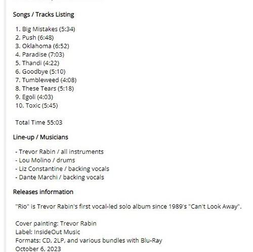 Attachment 1798 ABOUT TREVOR RABIN ...from progarchives.com Trevor Charles Rabinowitz - Born 13 January 1954 (Johannesburg, South Africa) Born in 1954 in Johannesburg, Trevor RABIN started playing guitar at the age of twelve, and within a year he was playing his first local gigs in his brother?s band. From there he formed his first group CONGLOMERATION, and was a session musician by the tender age of 17. His musical career was delayed by being drafted into the army, but on leaving he soon formed RABBITT with former CONGLOMERATION bandmates, Neil CLOUD and Ronnie ROBOT. RABBITT soon became the most successful rock act ever to come from the country, winning multiple awards and having hit albums and singles. He left RABBITT and moved to London in 1978 where he produced bands such MANFRED MANN'S EARTH BAND also released his debut solo album. He moved to LA in the early Eighties, where he came to the attention of Chris SQUIRE who was looking for a guitarist for his new band, which at that time was called CINEMA. However, after Jon ANDERSON joined the band the decision was taken to again take up the name YES, and the resulting album '90125' became the biggest selling of their career. Trevor was with Yes for four albums, and since leaving he has concentrated mostly on film scores, and has continued to work in multiple different styles of music, including progressive rock. At the time of writing he has released five solo albums, with the most recent coming out in 2012 Push, the track I chose takes me back to the best Yes atmospheres with excellent use of choirs I will always be grateful to Trevor Rabin for Endless Dream, one of the best Yes tracks, for having composed it, arranged it and even composed a good part of the bass parts, clashing with the great Chris Squire and getting into arguments and combined with the fact that Talk was the first album released with a independent label was not adequately promoted on the market, reaching position #20 in England and #33 in the United States. and so Talk remains Yes' most underrated album which includes Endless Dream, a masterpiece by Trevor Rabin ...but due to the clash with Squire and the problems of the lack of promotion of the album led Rabin to abandon Yes, creating a void filled by Billy Sherwood who I never liked and it may be a coincidence but the subsequent album OPEN YOUR EYES marks Yes's lowest point Attachment 1796 Hi friends 2023 Work in Progress..ive These are my best tracks of 2023 Track Title-Group or Artist-Album I'm Done with You-RIVERSIDE-ID.ENTITY Life Lines-SUNCHILD-Exotic Creatures and a Stolen Dream Scanning The Dark Horizon-JOHN IRVINE-Scanning The Dark Horizon Memories in a Box-SINGLE CELLED ORGANISM-EVENT HORIZON To_find_the_light_part_two-GREAT WIDE NOTHING-Hymns for Hungry Spirits, Vol. II Ghosts From The Future-OVERHEAD-Telepathic Minds (Disc 1) King_of_the_world-RPWL-Crime Scene(Disc 1) No Man's Land-TNNE-LIFE 3.0 Mysterious Forest, Pt. 1-KARFAGEN-Passage to the Forest of Mysterious Something New-MARTIN MILLER-Maze of My Mind Kill_the_sun_and_the_moon_and_the_stars-THE BLACK CAT'S EYE-The Empty Space Between A Seamount And Shock-Headed Julia Gargantuan.(Part One)-AMPLIFIER-Hologram The Beauty and the Least-MYSTERY-Redemption Scratches-INNER PROSPEKT-Canvas Three All Connected-YES-Mirror to the sky Summer Lies Beyond-COMEDY OF ERRORS-THRENODY FOR A DEAD QUEEN The Sacred Law of Retribution-TRITOP-RISE OF KASSANDRA Ingravita-BUHO ERMITANO-IMPLOSIONES Danger-ELOY-ECHOES FROM THE PAST Naturens katedral-LARS FREDRIK FRØISLIE-FIRE FORTELLINGER Ur askan-AGUSA-PRIMA MATERIA The 11th Chapter: The Nine, including a) The Fire (pt II), b) A Nonagon in Eight -RING VAN MÖBIUS-Commissioned Works Pt II - Six Drops of Poison Journey to the Center of the Mind -MARCO RAGNI-HALLUCINATORY EMBRYO Poker -I VIAGGI DI MADELEINE-TRA LUCE E OMBRA The Gathering-SKY PASSAGE-The Gathering Moving Through Tomorrow-SOUTHERN EMPIRE-Another World Tell Me-KARMAMOI-STRINGS FROM THE EDGE OF SOUND Liquid Suite-LA BOCCA DELLA VERITA-[Un]connected Stronghold -THE FLOWER KINGS-LOOK AT YOU NOW Helen-UNITOPIA-SEVEN CHAMBERS Actual Brutal Facts-STEVEN WILSON-THE HARMONY CODEX A Hymn for the Pioneers-SYNTH REPLICANTS-Time of Legends Push-TREVOR RABIN-Rio Attachment 1797 Attachment 1799 Push-TREVOR RABIN https://www.youtube.com/watch?v=0EiNeiz2hdE I found on YouTube this collection of songs written by Trevor Rabin in the years in which he was a member of YES... an excellent collection that I recommend you listen to https://www.youtube.com/watch?v=zrthdnsRYx4 GOOD LISTENING |