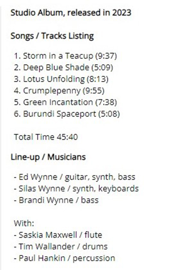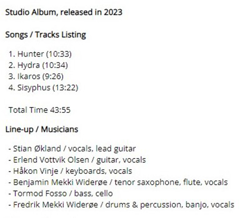 Attachment 1741 ABOUT RING VAN MÖBIUS ...from Prog Archives.com Ring Van Möbius biography Formed in Karmøy, Norway, around 2014 RING VAN MÖBIUS are a retro-prog band from Karmøy, Norway. They describe themselves as ''Progressive rock straight from 1971, but made today''. They played live shows in 2017 and in 2018 they released their debut ''Past the Evening Sun'' through Apollon Records. The core of the band consists of Thor Erik HELGESEN (keys), Håvard RASMUSSEN (bass) and Dag Olav HUSÅS (drums). Their sound is often compared to that of early ELP. Attachment 1740 Hi friends 2023 Work in Progress..ive These are my best tracks of 2023 Track Title-Group or Artist-Album I'm Done with You-RIVERSIDE-ID.ENTITY Life Lines-SUNCHILD-Exotic Creatures and a Stolen Dream Scanning The Dark Horizon-JOHN IRVINE-Scanning The Dark Horizon Memories in a Box-SINGLE CELLED ORGANISM-EVENT HORIZON To_find_the_light_part_two-GREAT WIDE NOTHING-Hymns for Hungry Spirits, Vol. II Ghosts From The Future-OVERHEAD-Telepathic Minds (Disc 1) King_of_the_world-RPWL-Crime Scene(Disc 1) No Man's Land-TNNE-LIFE 3.0 Mysterious Forest, Pt. 1-KARFAGEN-Passage to the Forest of Mysterious Something New-MARTIN MILLER-Maze of My Mind Kill_the_sun_and_the_moon_and_the_stars-THE BLACK CAT'S EYE-The Empty Space Between A Seamount And Shock-Headed Julia Gargantuan.(Part One)-AMPLIFIER-Hologram The Beauty and the Least-MYSTERY-Redemption Scratches-INNER PROSPEKT-Canvas Three All Connected-YES-Mirror to the sky Summer Lies Beyond-COMEDY OF ERRORS-THRENODY FOR A DEAD QUEEN The Sacred Law of Retribution-TRITOP-RISE OF KASSANDRA Ingravita-BUHO ERMITANO-IMPLOSIONES Danger-ELOY-ECHOES FROM THE PAST Naturens katedral-LARS FREDRIK FRØISLIE-FIRE FORTELLINGER Ur askan-AGUSA-PRIMA MATERIA The 11th Chapter: The Nine, including a) The Fire (pt II), b) A Nonagon in Eight -RING VAN MÖBIUS-Commissioned Works Pt II - Six Drops of Poison Attachment 1742 Attachment 1743 The 11th Chapter: The Nine, including a) The Fire (pt II), b) A Nonagon in Eight-RING VAN MÖBIUS https://ringvanmbius.bandcamp.com/tr...nagon-in-eight ********* but these further tracks of the long Ring Von Mobius suite should be noted, which improves his music from album to album The 9th Chapter: The Echoes, including a) The Drifting (pt II), b) Directions-RING VAN MÖBIUS https://ringvanmbius.bandcamp.com/tr...i-b-directions The 12th Chapter: The Conclusion, including a) Astray, b) The Finale-RING VAN MÖBIUS https://ringvanmbius.bandcamp.com/tr...y-b-the-finale GOOD LISTENING |