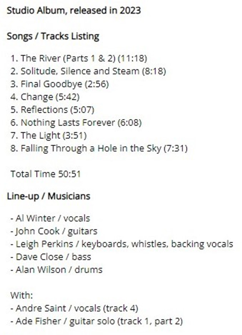 Attachment 1819 ABOUT THIS WINTER MACHINE ...from official website Multi award-winning progressive rock outfit This Winter Machine were formed in 2016 by vocalist/song-writer Al Winter Writing commenced quickly, and within a year they released their debut album 'The Man Who Never Was' The album was well received by audiences, press and radio worldwide They followed this with their sophomore album 'A Tower of Clocks' which cemented their reputation After further line up changes, they released their third album 'Kites' in 2021 to critical and audience acclaim, building on and expanding their fanbase. A fourth album is currently in the works and is in the later stages of writing and recording. It will be called 'The Clockwork Man' and is planned to be their first fully concept record The first demo from that upcoming album 'The River' was released to YouTube at the beginning of 2022 Attachment 1815 Hi friends 2023 Work in Progress..ive These are my best tracks of 2023 Track Title-Group or Artist-Album I'm Done with You-RIVERSIDE-ID.ENTITY Life Lines-SUNCHILD-Exotic Creatures and a Stolen Dream Scanning The Dark Horizon-JOHN IRVINE-Scanning The Dark Horizon Memories in a Box-SINGLE CELLED ORGANISM-EVENT HORIZON To_find_the_light_part_two-GREAT WIDE NOTHING-Hymns for Hungry Spirits, Vol. II Ghosts From The Future-OVERHEAD-Telepathic Minds (Disc 1) King_of_the_world-RPWL-Crime Scene(Disc 1) No Man's Land-TNNE-LIFE 3.0 Mysterious Forest, Pt. 1-KARFAGEN-Passage to the Forest of Mysterious Something New-MARTIN MILLER-Maze of My Mind Kill_the_sun_and_the_moon_and_the_stars-THE BLACK CAT'S EYE-The Empty Space Between A Seamount And Shock-Headed Julia Gargantuan.(Part One)-AMPLIFIER-Hologram The Beauty and the Least-MYSTERY-Redemption Scratches-INNER PROSPEKT-Canvas Three All Connected-YES-Mirror to the sky Summer Lies Beyond-COMEDY OF ERRORS-THRENODY FOR A DEAD QUEEN The Sacred Law of Retribution-TRITOP-RISE OF KASSANDRA Ingravita-BUHO ERMITANO-IMPLOSIONES Danger-ELOY-ECHOES FROM THE PAST Naturens katedral-LARS FREDRIK FRØISLIE-FIRE FORTELLINGER Ur askan-AGUSA-PRIMA MATERIA The 11th Chapter: The Nine, including a) The Fire (pt II), b) A Nonagon in Eight -RING VAN MÖBIUS-Commissioned Works Pt II - Six Drops of Poison Journey to the Center of the Mind -MARCO RAGNI-HALLUCINATORY EMBRYO Poker -I VIAGGI DI MADELEINE-TRA LUCE E OMBRA The Gathering-SKY PASSAGE-The Gathering Moving Through Tomorrow-SOUTHERN EMPIRE-Another World Tell Me-KARMAMOI-STRINGS FROM THE EDGE OF SOUND Liquid Suite-LA BOCCA DELLA VERITA-[Un]connected Stronghold -THE FLOWER KINGS-LOOK AT YOU NOW Helen-UNITOPIA-SEVEN CHAMBERS Actual Brutal Facts-STEVEN WILSON-THE HARMONY CODEX A Hymn for the Pioneers-SYNTH REPLICANTS-Time of Legends Push-TREVOR RABIN-Rio Labyrinthus-IL BALLETTO DI BRONZO-Lemures Hydra-SEVEN IMPALE-Summit The River-THIS WINTER MACHINE-The Clockwork man Attachment 1817 Attachment 1818 The River-THIS WINTER MACHINE https://thiswintermachine.bandcamp.com/track/the-river GOOD LISTENING |