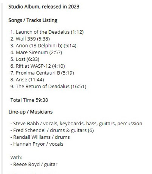 Attachment 1826 ABOUT GLASS HAMMER ...from official website Glass Hammer is an American progressive rock band from Chattanooga, Tennessee. They formed in 1992 when multi-instrumentalists Steve Babb and Fred Schendel began to write and record “Journey of the Dunadan”, a concept album based on the story of Aragorn from J.R.R. Tolkien’s The Lord of the Rings. To their surprise, the album sold several thousand units via the Internet, The QVC Shop-At-Home Network, and their own toll-free order number. As such, Babb and Schendel were convinced that the band was a project worth continuing. The stage was then set for a successful career that now includes numerous albums, DVDs and an enthusiastic, world-wide fan base that continues to grow at a steady rate. While many musicians have appeared on Glass Hammer albums over the years, Babb and Schendel have remained the core creative force of the band. Both play a variety of instruments, but Babb is better known as the bassist while Schendel is the primary keyboardist. And though they also sing, a number of other vocalists (most notably Michelle Young, Walter Moore, Susie Bogdanowicz, Carl Groves and Jon Davison) have also handled lead vocal duties. Lyrically, Glass Hammer is inspired mostly by their love of literature (most notably Tolkien, C. S. Lewis and John Krakauer) and Babb’s love of Victorian prose and medieval mythology. Musically, they lean towards 70’s driven symphonic rock, focusing on epic-length songs anchored by Babb’s distinctive bass guitar work and strong keyboard playing from Schendel; specifically Hammond organs in the tradition of ELP. They have a superb melodic flow to the music they make, encapsulating real power and dynamics without ever becoming overpowering. Their most apparent influences are Yes, ELP, Genesis, and, to a less noticeable extent, Camel. Fans and critics are usually quick to attest that Glass Hammer have managed to combine those influences into a unique style all their own. Critically acclaimed albums have continued to flow from the Glass Hammer studio, with the most successful and noteworthy being “Chronomtree” (2000), “Lex Rex” (2002), “The Inconsolable Secret” (2005) and “IF” (2010). Vocalists and fan-favorites Carl Groves and Susie Bogdanowicz took a temporary hiatus from the band after 2009 and vocalist Jon Davison took over as lead vocalist for three studio albums; “IF”, “Cor Cordium” and “Perilous”. Kamran Alan Shikoh joined the band at the same time taking on the role of guitarist. During the recording of “Perilous”, Davison also assumed the role as front-man for Yes. This led to Carl Groves rejoining the Glass Hammer in 2013 for live performances and recording. Aaron Raulston joined at the same time as drummer for the group. Susie Bogdanowicz rejoined in late 2013 and appeared along with Raulston, Groves and Shikoh in 2014 concerts. Glass Hammer’s “Ode To Echo” release for 2014 featured performances by many of the band’s vocalists, including Bogdanowicz, Young, Moore and Davison, though Carl Groves was handling the lion’s share of the vocal duties for the band. “The Breaking Of The World” followed in 2015 along with the two CD one DVD set “Double Live” which was recorded and filmed at ROSFest in Gettysburg, Pennsylvania. Carl Groves and Susie Bogdanowicz fronted the group throughout 2015. 2016’s “Valkyrie” saw the lineup shift somewhat as Carl Groves departed and Susie Bogdanowicz stepped to the fore. Before recording sessions began, Babb, Schendel, Shikoh and Raulston rehearsed the music of “Valkyrie” for several weeks, as if they were preparing for a live concert. This was a new approach for Glass Hammer album production. According to the band, this was done in order to better capture the live energy of an actual Glass Hammer performance. “Valkyrie” was also conceived as a “full-blown concept album” in the tradition of “Lex Rex”, and “The Inconsolable Secret”. In 2020 Glass Hammer released the first of Babb’s concept trilogy, Dreaming City. It would be followed in in 2021 with Skallagrim-Into The Breach, 2022’s At The Gate, and Babb’s first full-length novel, Skallagrim – In The Vales Of Pagarna. The saga tells the story of “the thief with the screaming sword”, a sword and sorcery inspired character. The band began to adopt a heavier sound for these projects, and introduced lead vocalist, Hannah Pryor to the fold. A session guitarist, Reese Boyd, who had played on several GH albums, became an official member in 2023 for the release of the band’s space rock homage, ARISE. Other prog musicians and rock artists have made contributions to Glass Hammer projects, including Jon Anderson of Yes, Arjen Lucassen, Rich Williams and David Ragsdale of Kansas, Rob Reed of Magenta and Randy Jackson of Zebra. Glass Hammer has also appeared with The Adonia String Trio and performed two concerts (2006-2007) with 120 plus member choirs from Belmont University and Lee University. Attachment 1825 Hi friends 2023 Work in Progress..ive These are my best tracks of 2023 Track Title-Group or Artist-Album I'm Done with You-RIVERSIDE-ID.ENTITY Life Lines-SUNCHILD-Exotic Creatures and a Stolen Dream Scanning The Dark Horizon-JOHN IRVINE-Scanning The Dark Horizon Memories in a Box-SINGLE CELLED ORGANISM-EVENT HORIZON To_find_the_light_part_two-GREAT WIDE NOTHING-Hymns for Hungry Spirits, Vol. II Ghosts From The Future-OVERHEAD-Telepathic Minds (Disc 1) King_of_the_world-RPWL-Crime Scene(Disc 1) No Man's Land-TNNE-LIFE 3.0 Mysterious Forest, Pt. 1-KARFAGEN-Passage to the Forest of Mysterious Something New-MARTIN MILLER-Maze of My Mind Kill_the_sun_and_the_moon_and_the_stars-THE BLACK CAT'S EYE-The Empty Space Between A Seamount And Shock-Headed Julia Gargantuan.(Part One)-AMPLIFIER-Hologram The Beauty and the Least-MYSTERY-Redemption Scratches-INNER PROSPEKT-Canvas Three All Connected-YES-Mirror to the sky Summer Lies Beyond-COMEDY
