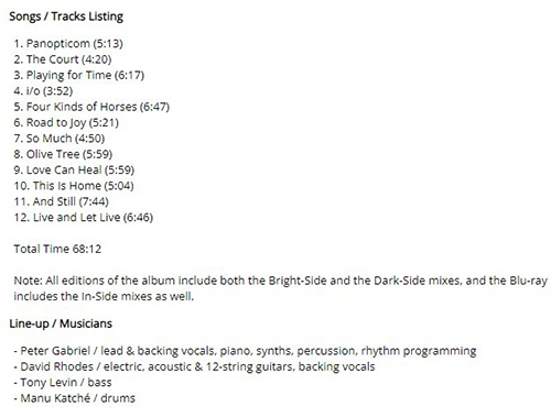 Attachment 1834 ABOUT PETER GABRIEL ...from Stephen Thomas Erlewine Peter Gabriel combines the theatricality of his time as the leader of Genesis in the early '70s with widely appealing sounds and songwriting, making him an international star with the credibility of a cult hero. With his eponymous debut solo album in 1977, he explored dark, cerebral territory, incorporating avant-garde, electronic, and worldbeat influences into his music. The record, as well as its two similarly titled successors, established Gabriel as a critically acclaimed solo artist, and with 1982's Security, he began to move into the mainstream; "Shock the Monkey" became his first Top 40 hit, paving the way for his breakthrough So in 1986. Accompanied by a series of groundbreaking videos and the number one single "Sledgehammer," So became a multi-platinum hit. Instead of capitalizing on his sudden success, Gabriel founded the Real World label, which proved an invaluable channel for international artists of every stripe to ply their trade. All this and his shepherding of political causes such as Amnesty International gained him a reputation as a true nobleman of the pop world, a role he has continued to fill well into the 21st century, as he toiled on i/o, his eighth album of original material that finally appeared in 2023, 21 years after Up. Following his departure from Genesis in 1976, Peter Gabriel began work on the first of three consecutive eponymously titled albums; each record was named Peter Gabriel, he said, as if they were editions of the same magazine. In 1977, his first solo album appeared and became a moderate success due to the single "Solsbury Hill." Another self-titled record followed in 1978, yet received comparatively weaker reviews. Gabriel's third eponymous album proved to be his artistic breakthrough, however. Produced by Steve Lillywhite and released in 1980, the record established Gabriel as one of rock's most ambitious, innovative musicians, as well as one of its most political -- "Biko," a song about a murdered anti-apartheid activist, became one of the biggest protest anthems of the '80s. "Games Without Frontiers," with its eerie chorus, nearly reached the Top 40. Birdy In 1982, Gabriel released Security, which was an even bigger success, earning positive reviews and going gold on the strength of the startling video for "Shock the Monkey." Just as his solo career was taking off, Gabriel participated in a one-shot Genesis reunion in order to finance his WOMAD -- World of Music, Arts and Dance -- Festival. WOMAD was designed to bring various world musics and customs to a Western audience, and it soon turned into an annual event, and a live double album was released that year to commemorate the event. As Gabriel worked on his fifth album, he contributed the soundtrack to Alan Parker's 1984 film Birdy. His score was highly praised and it won the Grand Jury Prize at Cannes that year. After founding Real World, Inc. -- a corporation devoted to developing bridges between technology and multi-ethnic arts -- in 1985, he completed his fifth album, So. Passion: Music for The Last Temptation of Christ Released in 1986, So became Gabriel's commercial breakthrough, largely because his Stax homage "Sledgehammer" was blessed with an innovative video that combined stop-action animation with live action. So climbed to number two as "Sledgehammer" hit number one, with "Big Time" -- featuring a video very similar to "Sledgehammer" -- reaching the Top Ten and "In Your Eyes" hitting the Top 30. As So was riding high on the American and British charts, Gabriel co-headlined the first benefit tour for Amnesty International in 1986 with Sting and U2. Another Amnesty International Tour followed in 1988, and the following year, Gabriel released Passion: Music for The Last Temptation of Christ, a collection of instrumentals used in Martin Scorsese's film. Passion was the furthest Gabriel delved into worldbeat, and the album was widely acclaimed, winning the Grammy Award in 1989 for Best New Age Performance. In 1990, he released the hits compilation Shaking the Tree. Us Gabriel labored long on the pop music follow-up to So, finally releasing Us in the spring of 1992. During the recording of Us, Gabriel went through a number of personal upheavals, including a painful divorce, and those tensions manifested themselves on Us, a much darker record than So. For various reasons, not the least of which was the fact that it was released six years after its predecessor, Us wasn't as commercially successful as So, despite positive reviews. Only one single, the "Sledgehammer" knockoff "Steam," reached the Top 40, and the album stalled at platinum sales. In 1993, Gabriel embarked on the most ambitious WOMAD tour to date, touring the United States with a roster including Crowded House, James, and Sinéad O'Connor, with whom he had an on-off romantic relationship. The following year, he released the double-disc Secret World Live, which went gold. Later in 1994, he released the CD-ROM Xplora, one of many projects he developed with Real World. For the rest of the decade, Gabriel concentrated on developing more multimedia projects for the company and working on a new studio album. Big Blue Ball Up was released in 2002, a full decade after Gabriel's last studio effort. Dense, cerebral, and often difficult, the record peaked at number nine but failed to sell well in America. It fared slightly better in Canada, where it went gold. He then turned his attention to a host of different projects, although the release of Big Blue Ball -- a compilation of collaborative performances recorded at Real World Studios during the '90s -- helped placate fans while Gabriel focused his energies elsewhere. He eventually returned to the studio for another album, 2010's Scratch My Back, which featured orchestral covers of songs originally performed by Radiohead, Arcade Fire, Paul Simon, David Bowie, and others. Gabriel uncharacteristically delivered the sequel