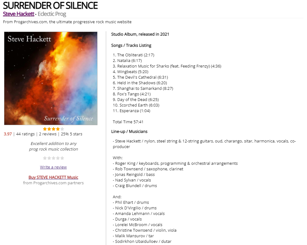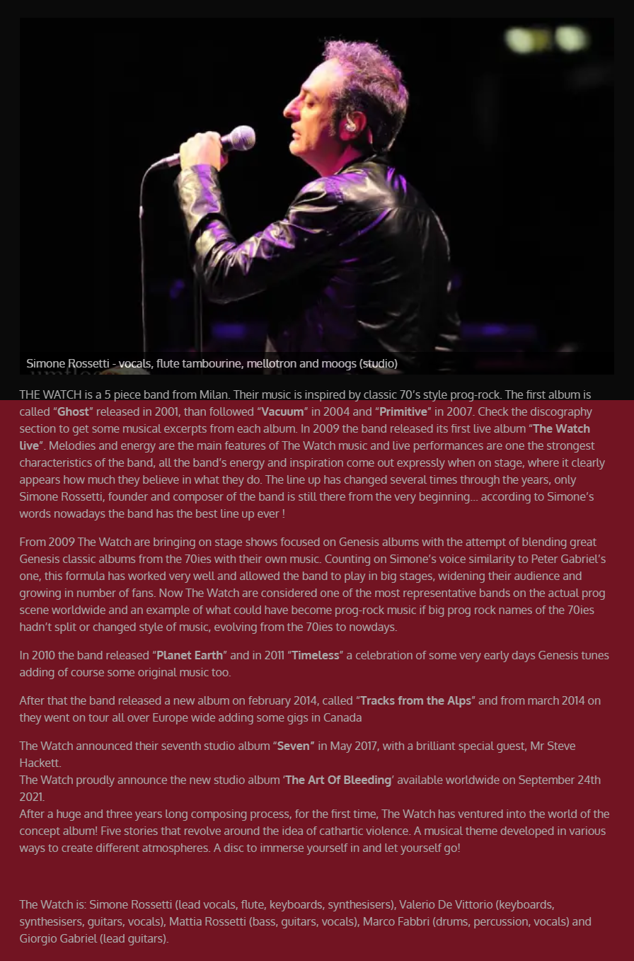 Attachment 1279 … ..The good moment for Italian progressive rock continues another good track from the latest The Watch album I chose "RED" Simone Rossetti founder and composer as well as voice and keyboard player is certainly the leader of this group that has now pushed the boundaries of their success by releasing their latest album everywhere. … ..and meanwhile their long European tour continues **** The good news for the Italian progressive also comes from the latest PFM album which, after the disappointing previous album, comes with some good tracks, one of which also includes Steve Hackett Jan Anderson and Flavio Premoli Attachment 1274 Hi friends 2021 Work in Progress..ive These are my best tracks of 2021 Track Title-Group or Artist-Album The Pilgrim Suite -Andrew Stone-The Pilgrim Discworld - Projector - Glass Kites -Glass Kites II The Trial of the King - Chromatic Aberration -The Trial of the King 4Th Dimension - ProAge-Wymiar Claustrophobia-Eyesberg-Claustrophobia Rainy Sunday-Maxxess-Reactivate Colorbox-Raven Sad-The Leaf And The Wing Bit By Bit-Syrinx Call-Mirrorneuron Power Trip Career Aspirations-Lucas Lee -Sindrome De Estocolmo The Darkness in the Light-Transatlantic-The Absolute Universe: Forevermore Soul_Of_Hundred_Lives-Inner Prospekt-Canvas Two Flare_2-Richard_Barbieri-Under a Spell Cosmic Krautrock-Stephan Thelen-Fractal Guitar 2 Rite_Of_Accession-Elephant9-Arrival Of The New Elders In Discipline And With Love-Kerrs Pink-Presence Of Life Marcha_De_Sonidos_Parte_2-Black Expression-Regreso A Casa Crossing-Cast-Vigesimus Alice_Krige_Parts_1_and_2-Heard Of Istinct-Unravel Altitude-Lifesigns-Altitude In_1985-Cosmograf-Rattrapante Sailing_To_Byzantium-Nad Sylvan-Spiritus Mundi Halo_Drive-Corrado Rustici -Interfulgent Tiresias-Noisy Diners-The Princess of the Allen Key Alice-The Mad Lab-Design of Experiments The Real History Of Tom Wheel, Pt. 1 (The Curse) -Fabricio Pipini(feat.Platinum)-Phantasicah (A Dreamer's Tale) Walk_Away-Bernardo Lanzetti-Horizontal Rain Broken Windows-Zygon-Earth And Sky The Ascent-The Emerald Down-To Touch The Sky Connecting_The_Dots-Confusion Field -Disconnection Complete Day_And_Age-Frost* -Day And Age Haunted_House-Joe_Bailey -Ghosts Winter-Resistor -The 5th Season Book Of Coming Forth By Day-Blacksmith Tales-The Dark Presence Iron John-The Samurai Of Prog -The Lady And The Lion And Other Grimm Tales Go Viral-Sylvan-One to Zero Room 101-Karmamoi-Room 101 Hidden Land-Daniel Eliseev Project -Lost Humanity Apollo-Big Big Train - Common Ground Dissolution-Smalltape -THE HUNGRY HEART Dark World-Metamorphosis-I'm Not A Hero White Ghosts-Alessandro Corvaglia-Out Of The Gate Beyond the Years-The Neal Morse Band -Innocence & Danger Shanghai_to_Samarkand-Steve Hackett -Surrender Of Silence The_Cashectomy-Benjamin Croft -Far And Distant Things Added Red-The Watch-The Art of Bleeding from The Watch official site Attachment 1275 The Watch Biography Attachment 1276 THE WATCH EUROPEAN TOUR DATES Attachment 1277 |