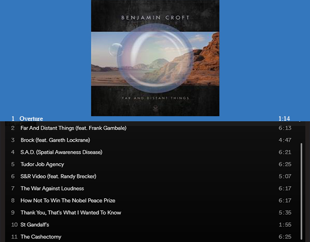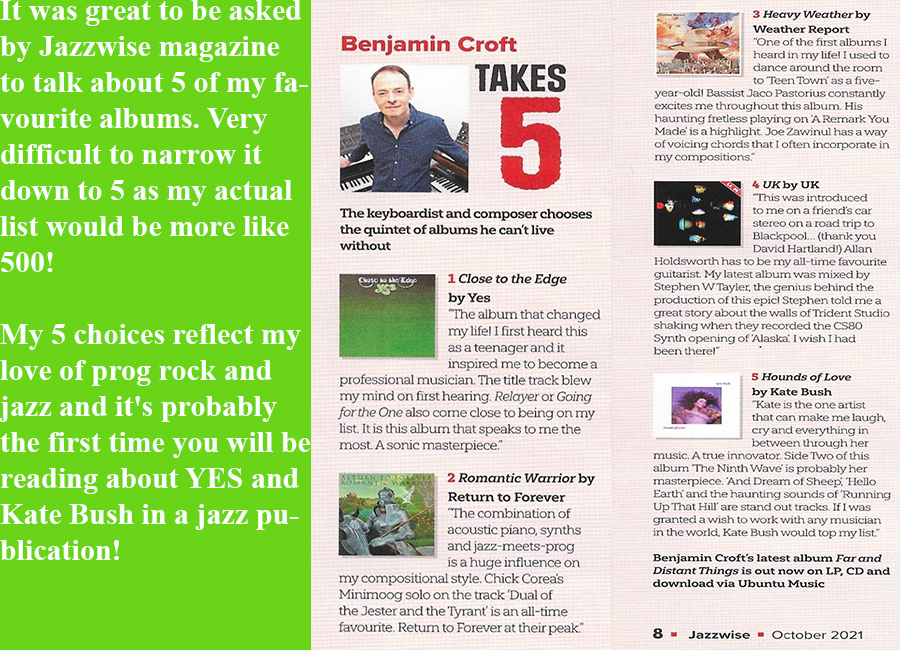 KEYBOARDIST AND COMPOSER I listened by chance a few days ago to a track from his second album and how it happens to me when I find it interesting, I went to find out everything about the artist and his path .... I learned a lot of information about Benjamin, a character that my intuition had interpreted well from the causal listening ... in the biography you will find all the news ... he mainly played jazz but later you discover that a jazz magazine JAZZWISE asks him to describe his preferences for the best 5 albums and here the surprise for me and for the magazine that expected 5 jazz albums is triggered and Benjamin declares instead: "Can't live without 1) Close To The Edge ..YES 2) Romantic Warrior ..RETURN TO FOREVER 3) Heavy Weather..WEATHER REPORT 4) UK ..UK 5) Hounds Of Love..KATE BUSH " From JAZZWISE MAGAZINE Attachment 1269 and also claims to hear and own many prog music albums in the photo some of his own Attachment 1270 "FAR AND DISTANT THINGS" is an excellent album very different from the first much more linked to Jazz, in this second album it explores new sounds, a cross between fusion and jazzrock played with great skill, helped in this realization by as many great artists .... In the album resist some tracks more attributable to jazz similar to those of the first album but given the good result of this new direction I am convinced that the next album will be even better and I do not shield that the surprises are over on the other hand the mix of preferences with YES and UK on the one hand and Joe Zawinul Jaco Pastorius Chick Korea Stanley Clarke on the other will surely influence the production of the next album… …. "The_Cashectomy" is the track I chose to include in my best of 2021 But as I said before, the whole album deserves attention. Attachment 1268 Hi friends 2021 Work in Progress..ive These are my best tracks of 2021 Track Title-Group or Artist-Album The Pilgrim Suite -Andrew Stone-The Pilgrim Discworld - Projector - Glass Kites -Glass Kites II The Trial of the King - Chromatic Aberration -The Trial of the King 4Th Dimension - ProAge-Wymiar Claustrophobia-Eyesberg-Claustrophobia Rainy Sunday-Maxxess-Reactivate Colorbox-Raven Sad-The Leaf And The Wing Bit By Bit-Syrinx Call-Mirrorneuron Power Trip Career Aspirations-Lucas Lee -Sindrome De Estocolmo The Darkness in the Light-Transatlantic-The Absolute Universe: Forevermore Soul_Of_Hundred_Lives-Inner Prospekt-Canvas Two Flare_2-Richard_Barbieri-Under a Spell Cosmic Krautrock-Stephan Thelen-Fractal Guitar 2 Rite_Of_Accession-Elephant9-Arrival Of The New Elders In Discipline And With Love-Kerrs Pink-Presence Of Life Marcha_De_Sonidos_Parte_2-Black Expression-Regreso A Casa Crossing-Cast-Vigesimus Alice_Krige_Parts_1_and_2-Heard Of Istinct-Unravel Altitude-Lifesigns-Altitude In_1985-Cosmograf-Rattrapante Sailing_To_Byzantium-Nad Sylvan-Spiritus Mundi Empire_Of_The_Elf-Jeffrey Erik Mack-The Forgotten Earth Halo_Drive-Corrado Rustici -Interfulgent Tiresias-Noisy Diners-The Princess of the Allen Key Alice-The Mad Lab-Design of Experiments The Real History Of Tom Wheel, Pt. 1 (The Curse) -Fabricio Pipini(feat.Platinum)-Phantasicah (A Dreamer's Tale) Walk_Away-Bernardo Lanzetti-Horizontal Rain Broken Windows-Zygon-Earth And Sky The Ascent-The Emerald Down-To Touch The Sky Connecting_The_Dots-Confusion Field -Disconnection Complete Day_And_Age-Frost* -Day And Age Haunted_House-Joe_Bailey -Ghosts Winter-Resistor -The 5th Season Book Of Coming Forth By Day-Blacksmith Tales-The Dark Presence Iron John-The Samurai Of Prog -The Lady And The Lion And Other Grimm Tales Go Viral-Sylvan-One to Zero Room 101-Karmamoi-Room 101 Hidden Land-Daniel Eliseev Project -Lost Humanity Apollo-Big Big Train - Common Ground Dissolution-Smalltape -THE HUNGRY HEART Dark World-Metamorphosis-I'm Not A Hero White Ghosts-Alessandro Corvaglia-Out Of The Gate Beyond the Years-The Neal Morse Band -Innocence & Danger Shanghai_to_Samarkand-Steve Hackett -Surrender Of Silence Added The_Cashectomy-Benjamin Croft -Far And Distant Things Attachment 1271 From Benjamin Croft Official Site Biography Benjamin Croft is a British keyboardist and composer who has recorded with Randy Brecker, Frank Gambale, Chad Wackerman, Allen Vizzutti, Barry Finnerty and Mike Miller. Known for his extensive knowledge and experience in a multitude of music genres, he is mostly associated with jazz. At the age of 7, he began piano and trumpet lessons, later going on to study at Leeds College of Music. After graduating, he completed several contracts on international cruise lines and moved to the US. During this period, he toured the world twice, and worked with artists as diverse as Belinda Carlisle, Leslie Garrett, The Temptations and The Platters. Benjamin relocated to London in 2012, where he became a regular performer at Ronnie Scott’s, the Jazz Cafe, Dean St and The Pheasantry Pizza Express Jazz Clubs, The Vortex, among others, playing with the finest musicians on the scene. He has also performed in the West End Show ’ Straight From the Heart’, and on TV shows such as ‘The Voice’ and ‘Britain’s Got Talent’. In 2018, he recorded for Beautiful South founder Dave Hemingway’s latest project ’Sunbirds', and has been working as a session musician, composer and arranger on several projects over the years. In March 2019, Benjamin released his first album ‘10 Reasons To...’ on 33Jazz Records. 12 original compositions reflecting his unique style and sound ; an audacious crossover between genres that seduced the press, and the public. His second album, "Far and Distant Things", was recorded throughout 2020. An ambitious project featuring legendary musicians from the US and more. It will be released on Ubuntu Music on August, 6th 2021. "FAR AND DISTANT THINGS" by BENJAMIN CROFT Attachment 1273 About the album: March 2018. The production of my first album had recently concluded and I was keen to keep the momentum going and keep writing. I decided that this new projec
