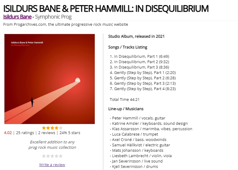 Attachment 1284 This time the track I chose belongs to a fusion of a group Isildurs Bane and Peter Hammill 2 totally different ways of interpreting music but following their meeting they managed to create a very captivating and sometimes hypnotic sound from art pop and prog to neoclassical and avant-garde all held together by one of the most singular and influential voices of the prog music… Peter Hammill… always open to experimentation and returned to the high levels reached in the first Van Der Graff Generator albums…. "Pawn Hearts", "Still Life" and "Godbluff" albums After the first experience resulted in the realization of the excellent "in Amazonia" Isildurs Bane and Peter Hammill continue the collaboration by making an equally interesting album "IN DISEQUILIBRIUM" made in 2 suites, one of 3 tracks and the other of 4 tracks I took an excerpt from the album review from Isildurs Bane's facebook page and is edited by From Zachary Nathanson's review __________________________________________________ ______ This is another challenge from the ensemble. It is one of the most surreal, wackiest, and insane releases I’ve listened to. There’s this crossover between ambient music, Frank Zappa, elements of the Rock in Opposition movement that blends well with the insane textures of both Gentle Giant and Goblin. And to be allowed to have King Crimson drummer Pat Mastelotto to lend a helping hand with the ensemble, it shows that Isildurs Bane are more than just a band, but a family helping others to bring In Disequilibrium to life. The challenges inside the group’s labyrinth, just got even bigger! From the opening 3-part title-track, it is like a movie being brought to life. You can hear elements of ‘The Sleepwalkers’ thrown in along with the xylophones channeling the midsection of ‘Peaches En Regalia’ from the Hot Rats period. Mats Johansson is like a conductor giving his bandmates and Peter directions on where he wants them to go. He has given each of the members, a lot of machine gun ammunitions to create these rapid firing textures. I can hear both Hällkvist and Croné doing these chase segments for Hammill to catch up to those insane time signatures to create this alternate score for Robert Clampett’s Bugs Bunny short from 1943, Falling Hare. Then, Johansson and Katrine Amsler share this futuristic temperature rising for Hammill’s voice to come in at the right moment. It’s one of those crazy and wackiest sequences that visions the ensemble and Hammill transforming the second half into a chaotic groove! The third and final section of the title-track takes us into the heart of the jungle channeling Peter Gabriel’s score to Martin Scorsese’s controversial classic,The Last Temptation of Christ. It gives us a sign for revelations to come where we witness a renewal to start new chapter in our daily lives. But it isn’t just that, it’s a new beginning for them to press the rewind button and start all over. Peter lets listeners know that there’s light at the end of the tunnel. And the big bright lights on the arrangements gives the ensemble enough rope to reach towards the surface and seeing the sunlight again. The four-part suite ‘Gently (Step by Step) closes the album. It becomes a calm after the storm with its piano, synthesizers, and xylophone setting up the empty ghost town of the dystopian wasteland that people are finally getting out of. You can almost feel a pin drop as the ghost-like vocals fill the city with Eagles soaring through the sky moving away from the nightmarish landscapes into a field of dreams. You can hear aspects of Peter’s solo work from The Silent Corner and the Empty Stage thrown into the mix. The symphonic structures along with its mournful organ work, Luca Calabrese’s trumpet echoes the funeral arrangements while Liesbeth’s violin sends the last rite to the city that once was beautiful, now a pile of rubble. Once you get to the third section, it becomes this epic ambient voyage that carries bits and pieces of Popol Vuh’s Aguirre as the survivors are sailing into unknown lands. Peter then gives a sermon to the fallen heroes inside his church as the musicians help churchgoers bring joy and happiness in their lives. They also have to understand that while they’ll never forget what has happened, it will be a part of their history that we will the next generation in the years to come, not to make the same mistakes again and again. In Disequilibrium is another welcoming return for the collaboration of Isildurs Bane’s partnership with Peter Hammill. As I’ve mentioned earlier, it is beautiful, sinister, epic, and unexpected changes that will make your mind blown away. Yes it may not be everyone’s cup of coffee per se, but it is like a stick of dynamite ready to explode at any second. __________________________________________________ _____________ Attachment 1288 Hi friends 2021 Work in Progress..ive These are my best tracks of 2021 Track Title-Group or Artist-Album The Pilgrim Suite -Andrew Stone-The Pilgrim Discworld - Projector - Glass Kites -Glass Kites II The Trial of the King - Chromatic Aberration -The Trial of the King 4Th Dimension - ProAge-Wymiar Claustrophobia-Eyesberg-Claustrophobia Rainy Sunday-Maxxess-Reactivate Colorbox-Raven Sad-The Leaf And The Wing Bit By Bit-Syrinx Call-Mirrorneuron Power Trip Career Aspirations-Lucas Lee -Sindrome De Estocolmo The Darkness in the Light-Transatlantic-The Absolute Universe: Forevermore Soul_Of_Hundred_Lives-Inner Prospekt-Canvas Two Flare_2-Richard_Barbieri-Under a Spell Cosmic Krautrock-Stephan Thelen-Fractal Guitar 2 Rite_Of_Accession-Elephant9-Arrival Of The New Elders In Discipline And With Love-Kerrs Pink-Presence Of Life Marcha_De_Sonidos_Parte_2-Black Expression-Regreso A Casa Crossing-Cast-Vigesimus Alice_Krige_Parts_1_and_2-Heard Of Istinct-Unravel Altitude-Lifesigns-Altitude In_1985-Cosmograf-Rattrapante Sailing_To_Byzantium-Nad Sylvan-Spiritus Mundi Halo_Drive-Corra