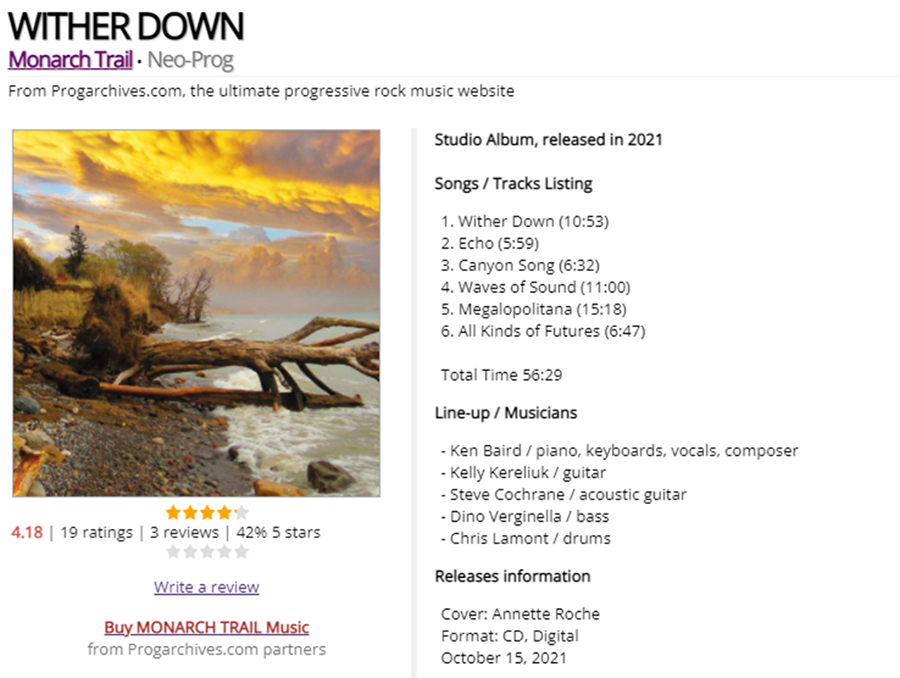 Attachment 1291 Attachment 1292 Third Album and Third Center for Monarch Trail and "Wither Down" not only continues the sequence of albums in a positive way but also raises the level of Track Quality to the point that it becomes difficult to choose one as the best ... in the previous 2 albums some less interesting track was here Ken Baird who continues to be the composer of all songs cancels the decrease in attention and creates an excellent album ... exceptional use of the piano in the opening song which then also gives the title of the album ... among those who have commented on the album more than someone has seen in the music of this album references to the first IQs…. and others a fusion of the styles of Genesis and Yes… .. I just want to thank the Monarch Trail for giving us some more excellent music. The track I have chosen is "Megalopolitana" Attachment 1295 Hi friends 2021 Work in Progress..ive These are my best tracks of 2021 Track Title-Group or Artist-Album The Pilgrim Suite -Andrew Stone-The Pilgrim Discworld - Projector - Glass Kites -Glass Kites II The Trial of the King - Chromatic Aberration -The Trial of the King 4Th Dimension - ProAge-Wymiar Claustrophobia-Eyesberg-Claustrophobia Rainy Sunday-Maxxess-Reactivate Colorbox-Raven Sad-The Leaf And The Wing Bit By Bit-Syrinx Call-Mirrorneuron Power Trip Career Aspirations-Lucas Lee -Sindrome De Estocolmo The Darkness in the Light-Transatlantic-The Absolute Universe: Forevermore Soul_Of_Hundred_Lives-Inner Prospekt-Canvas Two Flare_2-Richard_Barbieri-Under a Spell Cosmic Krautrock-Stephan Thelen-Fractal Guitar 2 Rite_Of_Accession-Elephant9-Arrival Of The New Elders In Discipline And With Love-Kerrs Pink-Presence Of Life Marcha_De_Sonidos_Parte_2-Black Expression-Regreso A Casa Crossing-Cast-Vigesimus Alice_Krige_Parts_1_and_2-Heard Of Istinct-Unravel Altitude-Lifesigns-Altitude In_1985-Cosmograf-Rattrapante Sailing_To_Byzantium-Nad Sylvan-Spiritus Mundi Halo_Drive-Corrado Rustici -Interfulgent Tiresias-Noisy Diners-The Princess of the Allen Key Alice-The Mad Lab-Design of Experiments The Real History Of Tom Wheel, Pt. 1 (The Curse) -Fabricio Pipini(feat.Platinum)-Phantasicah (A Dreamer's Tale) Walk_Away-Bernardo Lanzetti-Horizontal Rain Broken Windows-Zygon-Earth And Sky The Ascent-The Emerald Down-To Touch The Sky Connecting_The_Dots-Confusion Field -Disconnection Complete Day_And_Age-Frost* -Day And Age Haunted_House-Joe_Bailey -Ghosts Winter-Resistor -The 5th Season Book Of Coming Forth By Day-Blacksmith Tales-The Dark Presence Iron John-The Samurai Of Prog -The Lady And The Lion And Other Grimm Tales Go Viral-Sylvan-One to Zero Room 101-Karmamoi-Room 101 Hidden Land-Daniel Eliseev Project -Lost Humanity Apollo-Big Big Train - Common Ground Dissolution-Smalltape -THE HUNGRY HEART Dark World-Metamorphosis-I'm Not A Hero White Ghosts-Alessandro Corvaglia-Out Of The Gate Beyond the Years-The Neal Morse Band -Innocence & Danger Shanghai_to_Samarkand-Steve Hackett -Surrender Of Silence The_Cashectomy-Benjamin Croft -Far And Distant Things Red-The Watch-The Art of Bleeding In Disequilibrium, part 3-Isildurs Bane & Peter Hammill-In Disequilibrium Added Megalopolitana-Monarch Trail -Wither Down from http://www.progarchives.com/ Attachment 1293 Attachment 1294 |