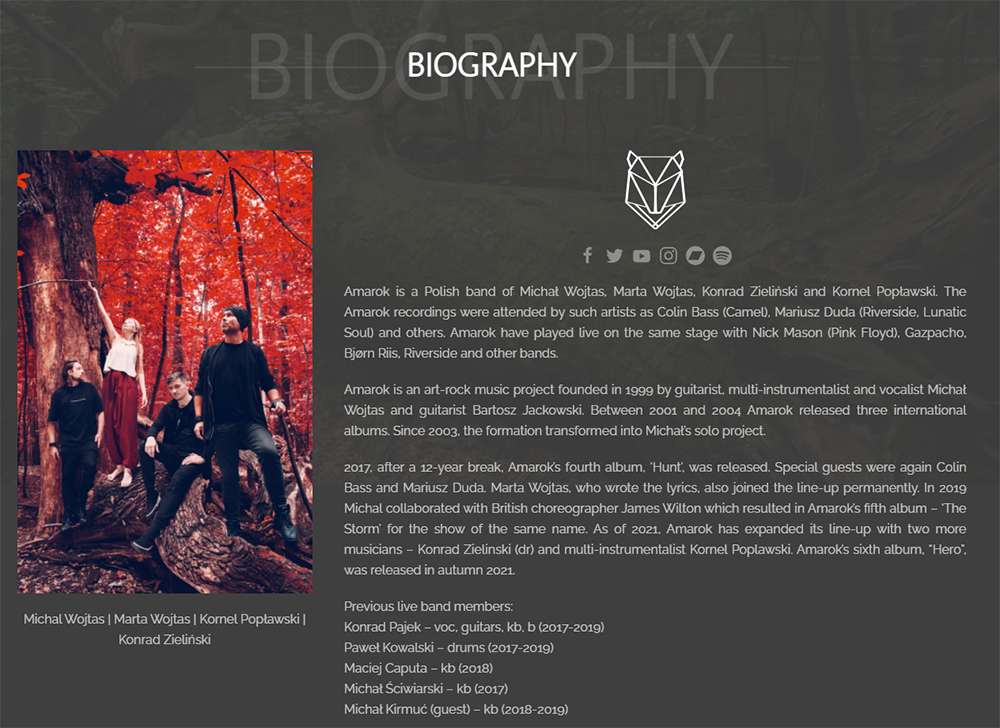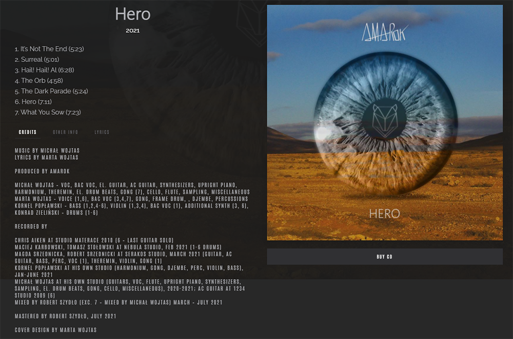 Attachment 1299 Attachment 1300 Amarok is back with a new album! Michał and Marta Wojtas are joined by their old friends – Kornel Popławski and Konrad Zieliński. The result of this collaboration is the album “Hero” – a spiritual sequel to the 2017 “Hunt”. Much like the aforementioned „Hunt”, the upcoming album presents a fusion of musical styles known and loved by fans and critics alike. Here the sounds of progressive rock folk and ambient mix together, complemented by a wonderful and subtle guitar virtuosity. The soundscape feels exotic, thanks to the use of uncommon instruments such as violin, theremin, wind gong, djembe, harmonium, flute, and rainsticks. The pieces have a strong lyrical layer, with their vocals referencing the ongoing digitalization of our life and the unsure position of a human in the future world. There are also beautiful instrumental fragments reminiscent of film scores similar in style to the depictions from the War of the Worlds by H.G. Wells. Hero is a story of a protagonist, fighting for survival, going up against reality and themselves. It’s about everyone courageously facing the unknown. The lyrics based on this idea, also touch on the current pandemic and the state of the world. The upcoming album „Hero” is a collection of innovative, fresh, and spatial compositions with just as good lyrical parts, that inquires into our current questions about the future. We recommend spending a while to relax, reflect and enter the world of this unique music. The climate of each and every piece mesmerizes the first time you hear it and brings you back again and again. Taken from the band's website The track I have chosen is "Hero" Attachment 1296 Hi friends 2021 Work in Progress..ive These are my best tracks of 2021 Track Title-Group or Artist-Album The Pilgrim Suite -Andrew Stone-The Pilgrim Discworld - Projector - Glass Kites -Glass Kites II The Trial of the King - Chromatic Aberration -The Trial of the King 4Th Dimension - ProAge-Wymiar Claustrophobia-Eyesberg-Claustrophobia Rainy Sunday-Maxxess-Reactivate Colorbox-Raven Sad-The Leaf And The Wing Bit By Bit-Syrinx Call-Mirrorneuron Power Trip Career Aspirations-Lucas Lee -Sindrome De Estocolmo The Darkness in the Light-Transatlantic-The Absolute Universe: Forevermore Soul_Of_Hundred_Lives-Inner Prospekt-Canvas Two Flare_2-Richard_Barbieri-Under a Spell Cosmic Krautrock-Stephan Thelen-Fractal Guitar 2 Rite_Of_Accession-Elephant9-Arrival Of The New Elders In Discipline And With Love-Kerrs Pink-Presence Of Life Marcha_De_Sonidos_Parte_2-Black Expression-Regreso A Casa Crossing-Cast-Vigesimus Alice_Krige_Parts_1_and_2-Heard Of Istinct-Unravel Altitude-Lifesigns-Altitude In_1985-Cosmograf-Rattrapante Sailing_To_Byzantium-Nad Sylvan-Spiritus Mundi Halo_Drive-Corrado Rustici -Interfulgent Tiresias-Noisy Diners-The Princess of the Allen Key Alice-The Mad Lab-Design of Experiments The Real History Of Tom Wheel, Pt. 1 (The Curse) -Fabricio Pipini(feat.Platinum)-Phantasicah (A Dreamer's Tale) Walk_Away-Bernardo Lanzetti-Horizontal Rain Broken Windows-Zygon-Earth And Sky The Ascent-The Emerald Down-To Touch The Sky Connecting_The_Dots-Confusion Field -Disconnection Complete Day_And_Age-Frost* -Day And Age Haunted_House-Joe_Bailey -Ghosts Winter-Resistor -The 5th Season Book Of Coming Forth By Day-Blacksmith Tales-The Dark Presence Iron John-The Samurai Of Prog -The Lady And The Lion And Other Grimm Tales Go Viral-Sylvan-One to Zero Room 101-Karmamoi-Room 101 Hidden Land-Daniel Eliseev Project -Lost Humanity Apollo-Big Big Train - Common Ground Dissolution-Smalltape -THE HUNGRY HEART Dark World-Metamorphosis-I'm Not A Hero White Ghosts-Alessandro Corvaglia-Out Of The Gate Beyond the Years-The Neal Morse Band -Innocence & Danger Shanghai_to_Samarkand-Steve Hackett -Surrender Of Silence The_Cashectomy-Benjamin Croft -Far And Distant Things Red-The Watch-The Art of Bleeding In Disequilibrium, part 3-Isildurs Bane & Peter Hammill-In Disequilibrium Megalopolitana-Monarch Trail -Wither Down Added Hero-Amarok-Hero Attachment 1301 Attachment 1302 Taken from the band's website HERO - AMAROK https://amarokmusic.bandcamp.com/track/hero GOOD LISTENING |