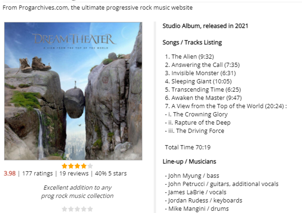 Attachment 1304 I live permanently in my ProgLand, I feel great and sometimes I like to make some visits to the border where I always find Dream Theater very happy or go to more distant lands such as electronic music or go to the territory of great jazzrock-fusion instrumentalists. ... today I chose to breathe the sound of this band that is classified as progressive metal but in many songs definitely metal but always very far from the metal of only noise of many groups ... The Dream Theater were born in 1985 from the meeting of JOHN PETRUCCI , JOHN MYUNG and MIKE PORTNOY who attended the same prestigious Berklee College of Music in Boston Taking into account only the current components in 1991 he joins the group JAMES LABRIE who responds to an announcement from the DT who were looking for a singer and finds himself in a club with 200 other aspirants and wins the challenge that has consecrated him a decisive component of the group's success, very generous in performances live just to make comparisons with the due differences what Robert Plant and Ian Gillan were for Led Zeppelin and Deep Purple in 1999 he joined the group JORDAN RUDESS which certainly contributes to adding a more prog and less metal sound and this thanks to his admission of being influenced by artists such as Keith Emerson, Tony Banks, Rick Wakeman and Patrick Moraz and having among the his favorite bands Gentle Giant, Yes, Genesis, Pink Floyd, Emerson, Lake & Palmer, King Crimson, Jimi Hendrix, Autechre, and Aphex Twin ... also very interested in any new devilry applicable to his keyboards in order to always generate new sounds. 2 Videos to learn more about the thousand facets of Jordan Rudess a guarantee why the sound of the DT does not turn towards only metal sound https://www.youtube.com/watch?v=kCimXv5LzcY https://www.youtube.com/watch?v=Cp9Ie9IvPTU in 2011 MIKE MANGINI last joined the band to replace Mike Portnoy's exit it's been 10 years now that the line-up hasn't changed and not only do I think it's the best ... but I also hope this remains returning to MIKE MANGINI I think JAMES LABRIE suggested his entry, who had him in his 3 albums only but apart from this possible recommendation, the biography of this drummer speaks of a child who at the age of 2 and a half was already having fun with a drums and at 9 he trained from 2 to 4 hours a day and then joined the DT with a 360 degree drum set, seeing him live in his percussion cage is a show. I am pleased to read many positive comments that recognize its value in the following video in which MIKE is training to face the World Tour and he does it with a reduced battery in the same configuration as the recording of the album but uses the base of the excellent ALIEN sent at a speed of 10% higher than the original this to find everything easier in live performances https://www.youtube.com/watch?v=EFx19PMxGTc Attachment 1305 And here we are finally at this umpteenth Dream Theater album with 2 excellent tracks inside, the first opens the album .. "Alien" and the last "A View from the Top of the World" both very suitable to open their next show on the world tour that are about to start in February 2022 ... both tracks have a long instrumental introduction with a strong impact that when it returns to the initial chorus opens the scene at the entrance of LaBrie ... we will see which song they choose to open the concert Taking a step back I like to insert the genesis of this album as told by the DT themselves From their Official Site __________________________________________________ ____________ Dream Theater – comprised of James LaBrie, John Petrucci, Jordan Rudess, John Myung and Mike Mangini - was in the middle of a sold-out world tour in support of their last release Distance Over Time and the 20th anniversary of Scenes From A Memory when a Global Pandemic brought the world to a stop. The musicians found themselves at home with LaBrie in Canada and the rest of the group in the States. As fate would have it, they’d just finished construction on DTHQ (Dream Theater Headquarters) —a combination live recording studio, rehearsal space, control room, equipment storage, and creative hive. With LaBrie in Canada, he initially wrote with the band via ZOOM on a monitor in DTHQ. In March 2021, he flew down to New York, quarantined, and recorded his vocals face-to-face with Petrucci. The album ultimately threaded together lean and uncompromising hooks with tried-and-true technical proficiency. “We just love to play our instruments,” observes Petrucci. “That never goes away. I love to be creative, write, and exercise that part of my mind. We’ve been able to do this for a long time, and we don’t take it for granted. Whenever we get together, we know we can’t disappoint ourselves or our fans, so we manage to try even harder.” “We approach every album like it’s our first,” adds LaBrie. “It’s been such a great ride, but we’re not going to stop.” __________________________________________________ ____________ I have chosen for my best tracks of 2021 "A View from the Top of the World" a suite consisting of 3 parts i. The Crowning Glory ii. Rapture of the Deep iii. The Driving Force which takes place with many variations of rhythm for a duration of over 20 minutes…. The long tracks of the DT are the ones that I like the most and are those in which they manage to enhance the qualities of all the members of the group and where it is also easier to identify them as a progressive metal band. Long live Dream Theater Attachment 1303 Hi friends 2021 Work in Progress..ive These are my best tracks of 2021 Track Title-Group or Artist-Album The Pilgrim Suite -Andrew Stone-The Pilgrim Discworld - Projector - Glass Kites -Glass Kites II The Trial of the King - Chromatic Aberration -The Trial of the King 4Th Dimension - ProAge-Wymiar Claustrophobia-Eyesberg-Claustrophobia Rainy Sunday-Maxxess-Reactivate Colorbox-Raven Sad-The Leaf And The Wing Bit By Bit-Syrinx Call-Mirr
