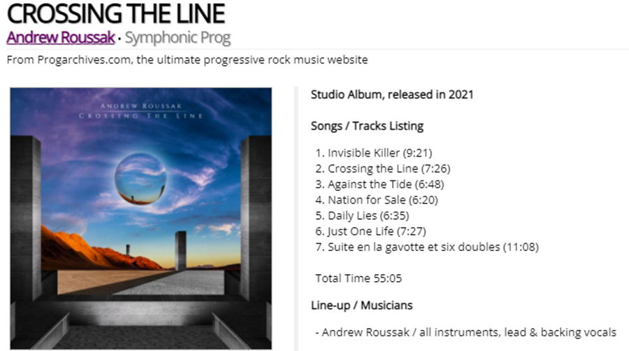 Attachment 1317 Attachment 1318 Attachment 1316 Hi friends 2021 Work in Progress..ive These are my best tracks of 2021 Track Title-Group or Artist-Album The Pilgrim Suite -Andrew Stone-The Pilgrim Discworld - Projector - Glass Kites -Glass Kites II The Trial of the King - Chromatic Aberration -The Trial of the King 4Th Dimension - ProAge-Wymiar Claustrophobia-Eyesberg-Claustrophobia Rainy Sunday-Maxxess-Reactivate Colorbox-Raven Sad-The Leaf And The Wing Bit By Bit-Syrinx Call-Mirrorneuron Power Trip Career Aspirations-Lucas Lee -Sindrome De Estocolmo The Darkness in the Light-Transatlantic-The Absolute Universe: Forevermore Soul_Of_Hundred_Lives-Inner Prospekt-Canvas Two Flare_2-Richard_Barbieri-Under a Spell Cosmic Krautrock-Stephan Thelen-Fractal Guitar 2 Rite_Of_Accession-Elephant9-Arrival Of The New Elders In Discipline And With Love-Kerrs Pink-Presence Of Life Marcha_De_Sonidos_Parte_2-Black Expression-Regreso A Casa Crossing-Cast-Vigesimus Alice_Krige_Parts_1_and_2-Heard Of Istinct-Unravel Altitude-Lifesigns-Altitude In_1985-Cosmograf-Rattrapante Sailing_To_Byzantium-Nad Sylvan-Spiritus Mundi Halo_Drive-Corrado Rustici -Interfulgent Tiresias-Noisy Diners-The Princess of the Allen Key Alice-The Mad Lab-Design of Experiments The Real History Of Tom Wheel, Pt. 1 (The Curse) -Fabricio Pipini(feat.Platinum)-Phantasicah (A Dreamer's Tale) Walk_Away-Bernardo Lanzetti-Horizontal Rain Broken Windows-Zygon-Earth And Sky The Ascent-The Emerald Down-To Touch The Sky Connecting_The_Dots-Confusion Field -Disconnection Complete Day_And_Age-Frost* -Day And Age Haunted_House-Joe_Bailey -Ghosts Winter-Resistor -The 5th Season Book Of Coming Forth By Day-Blacksmith Tales-The Dark Presence Iron John-The Samurai Of Prog -The Lady And The Lion And Other Grimm Tales Go Viral-Sylvan-One to Zero Room 101-Karmamoi-Room 101 Hidden Land-Daniel Eliseev Project -Lost Humanity Apollo-Big Big Train - Common Ground Dissolution-Smalltape -THE HUNGRY HEART Dark World-Metamorphosis-I'm Not A Hero White Ghosts-Alessandro Corvaglia-Out Of The Gate Beyond the Years-The Neal Morse Band -Innocence & Danger Shanghai_to_Samarkand-Steve Hackett -Surrender Of Silence The_Cashectomy-Benjamin Croft -Far And Distant Things Red-The Watch-The Art of Bleeding In Disequilibrium, part 3-Isildurs Bane & Peter Hammill-In Disequilibrium Megalopolitana-Monarch Trail -Wither Down Hero-Amarok-Hero A View From The Top Of The World-Dream Theater- A View From The Top Of The World Added Invisible Killer-Andrew Roussak- Crossing the Line Attachment 1319 all the instruments are played by Andrew and also the voices including the choirs I chose the track "Invisible Killer" but the album contains other tracks worthy of attention .... here the youtube version of the track Invisible Killer-Andrew Roussak https://www.youtube.com/watch?v=qBsenkZzUG4 GOOD LISTENING |