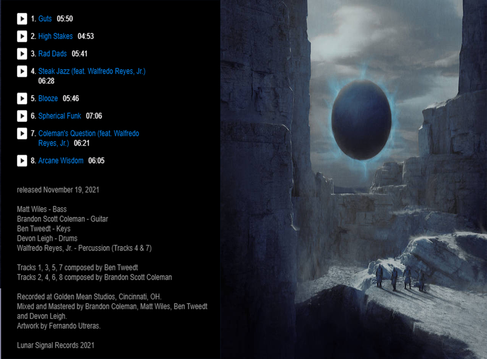 Attachment 1325 Spherical Agenda hails from Cincinnati, OH, and features some of the best prog players in the Midwest .... Bassist Matt Wiles, drummer Devon Leigh, keyboardist Ben Tweedt and guitarist Brandon Coleman create a sound that blends progressive rock, jazz and fusion. ARCANE WISDOM, the band's entire debut album, is an eclectic assortment of compositions with diverse musical influences. The album deals with jazz-rock in its various facets while always keeping the level of music high, an entire instrumental album ... demonstrating a richness that means that on the first album they did not do anything wrong and certainly a group not to be underestimated anything. and certainly that it could certainly give us other albums of the same level but also certainly superior to this one ... difficult to find the best song, I have identified 3 songs, I have a preference on "GUTS" but the doubt on other 2 "STEAK JAZZ" and "COLEMAN'S QUESTION" the other songs are also very respectable and without a doubt those who love jazzrock will have a new group to follow Attachment 1320 Hi friends 2021 Work in Progress..ive These are my best tracks of 2021 Track Title-Group or Artist-Album The Pilgrim Suite -Andrew Stone-The Pilgrim Discworld - Projector - Glass Kites -Glass Kites II The Trial of the King - Chromatic Aberration -The Trial of the King 4Th Dimension - ProAge-Wymiar Claustrophobia-Eyesberg-Claustrophobia Rainy Sunday-Maxxess-Reactivate Colorbox-Raven Sad-The Leaf And The Wing Bit By Bit-Syrinx Call-Mirrorneuron Power Trip Career Aspirations-Lucas Lee -Sindrome De Estocolmo The Darkness in the Light-Transatlantic-The Absolute Universe: Forevermore Soul_Of_Hundred_Lives-Inner Prospekt-Canvas Two Flare_2-Richard_Barbieri-Under a Spell Cosmic Krautrock-Stephan Thelen-Fractal Guitar 2 Rite_Of_Accession-Elephant9-Arrival Of The New Elders In Discipline And With Love-Kerrs Pink-Presence Of Life Marcha_De_Sonidos_Parte_2-Black Expression-Regreso A Casa Crossing-Cast-Vigesimus Alice_Krige_Parts_1_and_2-Heard Of Istinct-Unravel Altitude-Lifesigns-Altitude In_1985-Cosmograf-Rattrapante Sailing_To_Byzantium-Nad Sylvan-Spiritus Mundi Halo_Drive-Corrado Rustici -Interfulgent Tiresias-Noisy Diners-The Princess of the Allen Key Alice-The Mad Lab-Design of Experiments The Real History Of Tom Wheel, Pt. 1 (The Curse) -Fabricio Pipini(feat.Platinum)-Phantasicah (A Dreamer's Tale) Walk_Away-Bernardo Lanzetti-Horizontal Rain Broken Windows-Zygon-Earth And Sky The Ascent-The Emerald Down-To Touch The Sky Connecting_The_Dots-Confusion Field -Disconnection Complete Day_And_Age-Frost* -Day And Age Haunted_House-Joe_Bailey -Ghosts Winter-Resistor -The 5th Season Book Of Coming Forth By Day-Blacksmith Tales-The Dark Presence Iron John-The Samurai Of Prog -The Lady And The Lion And Other Grimm Tales Go Viral-Sylvan-One to Zero Room 101-Karmamoi-Room 101 Hidden Land-Daniel Eliseev Project -Lost Humanity Apollo-Big Big Train - Common Ground Dissolution-Smalltape -THE HUNGRY HEART Dark World-Metamorphosis-I'm Not A Hero White Ghosts-Alessandro Corvaglia-Out Of The Gate Beyond the Years-The Neal Morse Band -Innocence & Danger Shanghai_to_Samarkand-Steve Hackett -Surrender Of Silence The_Cashectomy-Benjamin Croft -Far And Distant Things Red-The Watch-The Art of Bleeding In Disequilibrium, part 3-Isildurs Bane & Peter Hammill-In Disequilibrium Megalopolitana-Monarch Trail -Wither Down Hero-Amarok-Hero A View From The Top Of The World-Dream Theater- A View From The Top Of The World Invisible Killer-Andrew Roussak- Crossing the Line Added Guts-Spherical Agenda-Arcane Wisdom Attachment 1323 Guts-Spherical Agenda https://sphericalagenda.bandcamp.com/track/guts-2 .... the doubt in the choice with: Coleman's Question-Spherical Agenda https://sphericalagenda.bandcamp.com...edo-reyes-jr-2 Steak Jazz-Spherical Agenda https://sphericalagenda.bandcamp.com...fredo-reyes-jr GOOD LISTENING .....and finally the video of the long live version of the excellent "Steak Jazz" https://www.youtube.com/watch?v=H2SDmjA8WhI |