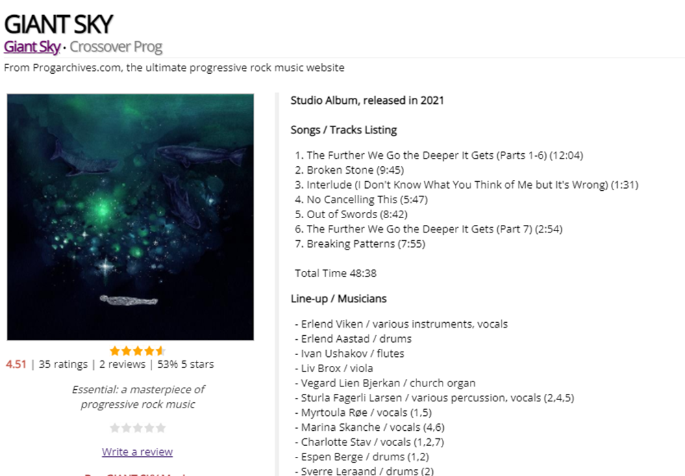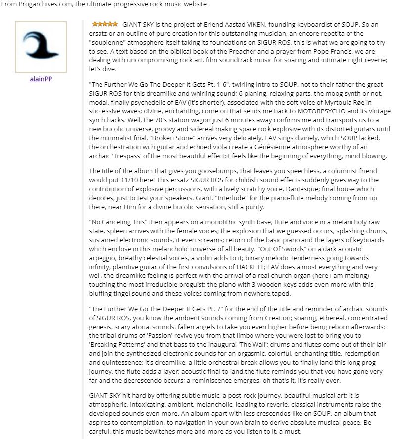 Attachment 1331 From Progarchives.com Giant Sky biography A new Norwegian act GIANT SKY were founded as a side project of SOUP by the founder / composer / keyboardist Erlend VIKEN in 2020. They've embarked themselves upon the debut creation recorded from January until May in 2020. Their eponymous 'concept' album saw the light finally upon June 4, 2021, in collaboration with lots of artists around them. Attachment 1333 Attachment 1330 Hi friends 2021 Work in Progress..ive These are my best tracks of 2021 Track Title-Group or Artist-Album The Pilgrim Suite -Andrew Stone-The Pilgrim Discworld - Projector - Glass Kites -Glass Kites II The Trial of the King - Chromatic Aberration -The Trial of the King 4Th Dimension - ProAge-Wymiar Claustrophobia-Eyesberg-Claustrophobia Rainy Sunday-Maxxess-Reactivate Colorbox-Raven Sad-The Leaf And The Wing Bit By Bit-Syrinx Call-Mirrorneuron Power Trip Career Aspirations-Lucas Lee -Sindrome De Estocolmo The Darkness in the Light-Transatlantic-The Absolute Universe: Forevermore Soul_Of_Hundred_Lives-Inner Prospekt-Canvas Two Flare_2-Richard_Barbieri-Under a Spell Cosmic Krautrock-Stephan Thelen-Fractal Guitar 2 Rite_Of_Accession-Elephant9-Arrival Of The New Elders In Discipline And With Love-Kerrs Pink-Presence Of Life Marcha_De_Sonidos_Parte_2-Black Expression-Regreso A Casa Crossing-Cast-Vigesimus Alice_Krige_Parts_1_and_2-Heard Of Istinct-Unravel Altitude-Lifesigns-Altitude In_1985-Cosmograf-Rattrapante Sailing_To_Byzantium-Nad Sylvan-Spiritus Mundi Halo_Drive-Corrado Rustici -Interfulgent Tiresias-Noisy Diners-The Princess of the Allen Key Alice-The Mad Lab-Design of Experiments The Real History Of Tom Wheel, Pt. 1 (The Curse) -Fabricio Pipini(feat.Platinum)-Phantasicah (A Dreamer's Tale) Walk_Away-Bernardo Lanzetti-Horizontal Rain Broken Windows-Zygon-Earth And Sky The Ascent-The Emerald Down-To Touch The Sky Connecting_The_Dots-Confusion Field -Disconnection Complete Day_And_Age-Frost* -Day And Age Haunted_House-Joe_Bailey -Ghosts Winter-Resistor -The 5th Season Book Of Coming Forth By Day-Blacksmith Tales-The Dark Presence Iron John-The Samurai Of Prog -The Lady And The Lion And Other Grimm Tales Go Viral-Sylvan-One to Zero Room 101-Karmamoi-Room 101 Hidden Land-Daniel Eliseev Project -Lost Humanity Apollo-Big Big Train - Common Ground Dissolution-Smalltape -THE HUNGRY HEART Dark World-Metamorphosis-I'm Not A Hero White Ghosts-Alessandro Corvaglia-Out Of The Gate Beyond the Years-The Neal Morse Band -Innocence & Danger Shanghai_to_Samarkand-Steve Hackett -Surrender Of Silence The_Cashectomy-Benjamin Croft -Far And Distant Things Red-The Watch-The Art of Bleeding In Disequilibrium, part 3-Isildurs Bane & Peter Hammill-In Disequilibrium Megalopolitana-Monarch Trail -Wither Down Hero-Amarok-Hero A View From The Top Of The World-Dream Theater- A View From The Top Of The World Invisible Killer-Andrew Roussak- Crossing the Line Guts-Spherical Agenda-Arcane Wisdom Added The Further We Go The Deeper It Gets Pt. 1-6-Giant Sky-Giant Sky Attachment 1332 The Further We Go The Deeper It Gets Pt. 1-6-Giant Sky https://giantskyband.bandcamp.com/tr...it-gets-pt-1-6 GOOD LISTENING |