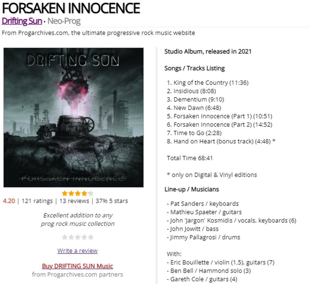 Attachment 1334 DRIFTING SUN - FORSAKEN INNOCENCE A Good Neo Prog Album featuring IQ bassist JOHN JOWITT The Track I chose is: Forsaken Innocence (Part 1) follows the Biography and a series of comments on the Group and the Album From Progarchives.com Drifting Sun biography Founded in Chesham, UK circa 1994 - Hiatus between 1999-2013 - Reformed in 2014 DRIFTING SUN were formed sometime during early-90's (originally named Drama), after French natives Pat Sanders (keyboards) and Manu Sibona (bass) left their homecountry and landed in the UK. There they met American singer Rafe Pomeroy and four pieces were recorded in a London-based studio, then sent to Musea for evaluation. The French label decided to sign the band on their branch-label Brennus and in 1996 the self-titled debut of the band sees the light with Karl Groom participating on one track. Drifting Sun decided to move on as an independent group, the line-up was expanded with the addition of Tobin Bryant and Bryant's friend, guitarist John Spearman, while Pomerey was replaced by another American vocalist, Chris Martini.By the end of the year 1998 the band had launched the sophomore effort "On the Rebound". What followed was a very long break, but recently Sanders gave his band another chance, gathering a new line-up with singer Peter Falconer, drummer Will Jones and bassist/guitarist Dan Storey. The third work of DRIFTING SUN "Trip the Life Fantastic" was released in early 2015, a digital album, available via several online digital stores. __________________________________________________ ___________ More adventurous and daring than anything Arena, IQ or Pendragon have done. Most like Magenta at its finest feisty moments. (Progarchives) One of the best albums of 2021 so far and in my opinion their best to date (Progarchives) Let's hope that this collaboration will continue, because the first outcome of it is simply wonderful! (Progarchives) Together with this current line-up, I am sure this will wind up at the very top of 2021's lists for most, if not all, prog aficionados out there. It is THAT good! (Progarchives) An excellent album for any prog lover to test out for themselves. (Progarchives) There are a number of very good Prog bands around at the moment but I have to say that Drifting Sun are making music that works on just about every level and of all I’ve heard this year ‘Forsaken Innocence’ is definitely the best of them. (music-news/UK) “Forsaken Innocence” is a merciless piece of art. (Progenrock/The Netherlands) If you don’t know Drifting Sun yet, it’s time to open the door to he magic with “Forsaken Innocence”, their latest masterpiece. (Rock at Night/USA) L'album de la consécration ultime, l'avenir nous le dira? Indispensable à mes yeux et à mes oreilles. (Profil Prog/Canada) When a new studio work by DRIFTING SUN is released, nothing more than a masterpiece can be expected... in response to the immense advance praise, DRIFTING SUN present a 70-minute mammoth work. (Saitenkult/Germany) This is a giant of an album. (Background/The Netherlands) Cet album est bien sûr destiné à tous les progueux comme à tous les amateurs de belle musique où mélodie et technique font bon ménage. (Music in Belgium/Belgium) Overall Drifting Sun has created a very nice neo-progressive album, with great instrumental parts and a vocalist showing his best side. (Prog Space/USA) This album is as zesty a piece of neo-prog as you are likely to find. It is a monumental statement for Drifting Sun. The Spirit of Progressive Rock/UK) Drifting Sun nous balance, sans en avoir l’air, un grand album, peut-être même le meilleur de leur discographie, avec une production soignée et un sens de la composition qui fait mouche à tous les coups. « Forsaken Innocence » hisse le groupe au niveau des formations clés du paysage progressif! (ProgCritique/France) A massive progressive tour-de-force. (musicarockprogresivo/Spain) The whole band is in awesome form and the performances have a character of their own, without however overshadowing the compositions. (Progrocks/Greece) This new album is truly the pinnacle of their work so far. It’s an engaging, captivating and sensational listen every time you press play and is deservedly up there fighting for the honours of album of the year. (Progradar/UK) The strongest “Drifting Sun‘ album to date. When it comes to dynamic-melodic prog, they are pretty much the measure of all things at the moment. (Empire/Germany) Without a doubt “Forsaken Innocence” is the best album in their oeuvre. And perhaps, time will tell, a neoprog icon. (ProgWereld/The Netherlands) Beautiful compositions, warm atmospheres and exquisite chamber rock touches help to compose an aesthetically perfect album. (rocking/Greece) Drifting Sun parmi les grands, cette fois, j’en fais le pari! (Prog Censor/France) It just made it on my top-10-album-of-the-year-2021-list (despite fierce competition). (DPRP/The Netherlands) Forsaken Innocence is without a doubt the best Drifting Sun has ever made and is bursting with beautiful songs with everything a lover of well-made, well-played and well-sung prog rock could wish for. (Eriks Progtracks/The Netherlands) Forsaken Innocence sort Drifting Sun de l'ornière 'néo' où il a été confiné jusqu'ici. Sa musique est désormais plus grandiose, plus travaillée et plus diverse. (Dragon Jazz/France) New Drifting Sun album, released on October 27th, 2021 Attachment 1336 Hi friends 2021 Work in Progress..ive These are my best tracks of 2021 Track Title-Group or Artist-Album The Pilgrim Suite -Andrew Stone-The Pilgrim Discworld - Projector - Glass Kites -Glass Kites II The Trial of the King - Chromatic Aberration -The Trial of the King 4Th Dimension - ProAge-Wymiar Claustrophobia-Eyesberg-Claustrophobia Rainy Sunday-Maxxess-Reactivate Colorbox-Raven Sad-The Leaf And The Wing Bit By Bit-Syrinx Call-Mirrorneuron Power Trip Career Aspirations-Lucas Lee -Sindrome De Estocolmo The Da