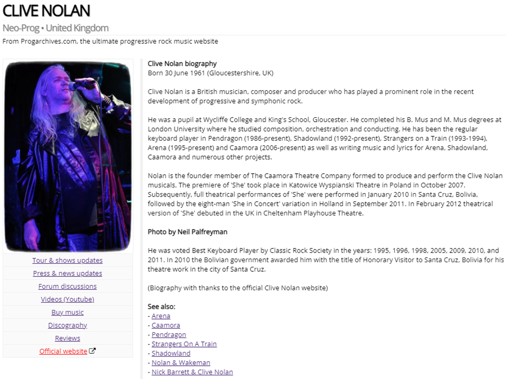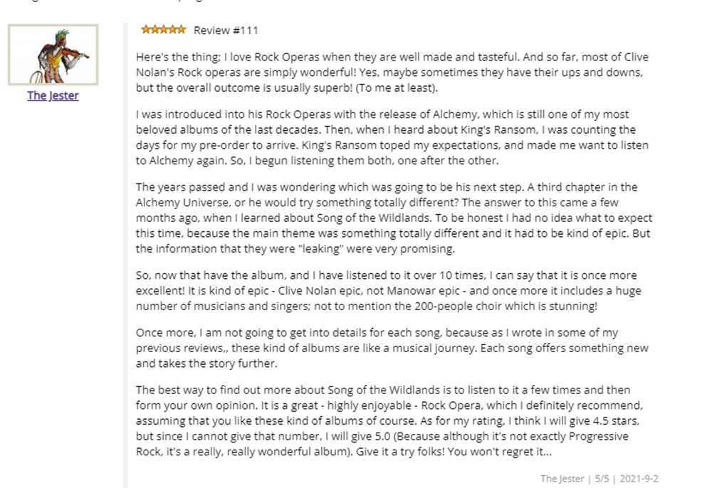 Attachment 1347 "Song of the Wildlands" an album by Clive Nolan one of the most famous keyboard players ex Pendagron ex Arena and many other groups, he collaborated on some albums with Oliver Wakeman son of Rick Wakeman and perhaps this frequentation led him to write "Song of the Wildlands" a rock work that must be listened to from beginning to end just to understand the style is that of "Journey to the Center of the Earth" by Rick Wakeman .... the atmospheres of the story translated into music are very beautiful ... the sung parts. ... many artists have collaborated ... and the choirs formed by 200 people are also very beautiful. I will not extract a track from this album for my 2021 show precisely because it must be taken as a single track to be listened to all at once from start to finish and for this reason I recommend listening to this excellent album to those who like the genre. From Progarchives.com Attachment 1341 Attachment 1342 Attachment 1348 Attachment 1344 Song of the Wildlands-Clive Nolan https://clivenolan.crimerecords.no/a...-the-wildlands GOOD LISTENING |