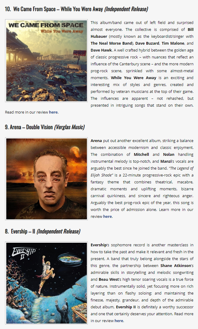 1 - The Tangent - Proxy 2 - Umphrey’s McGee - It's Not Us 3 - The Samurai of Prog - Archiviarum 4 - Spock’s Beard - Noise Floor 5 - Glass Hammer - Chronomonaut 6 - Roine Stolt's The Flower King - Manifesto Of An Alchemist 7 - Regal Worm - Pig Views 8 - 3RDegree - Ones & Zeros 9 - Visual Cliff - Refuge 10- Peter Gee - The Bible |