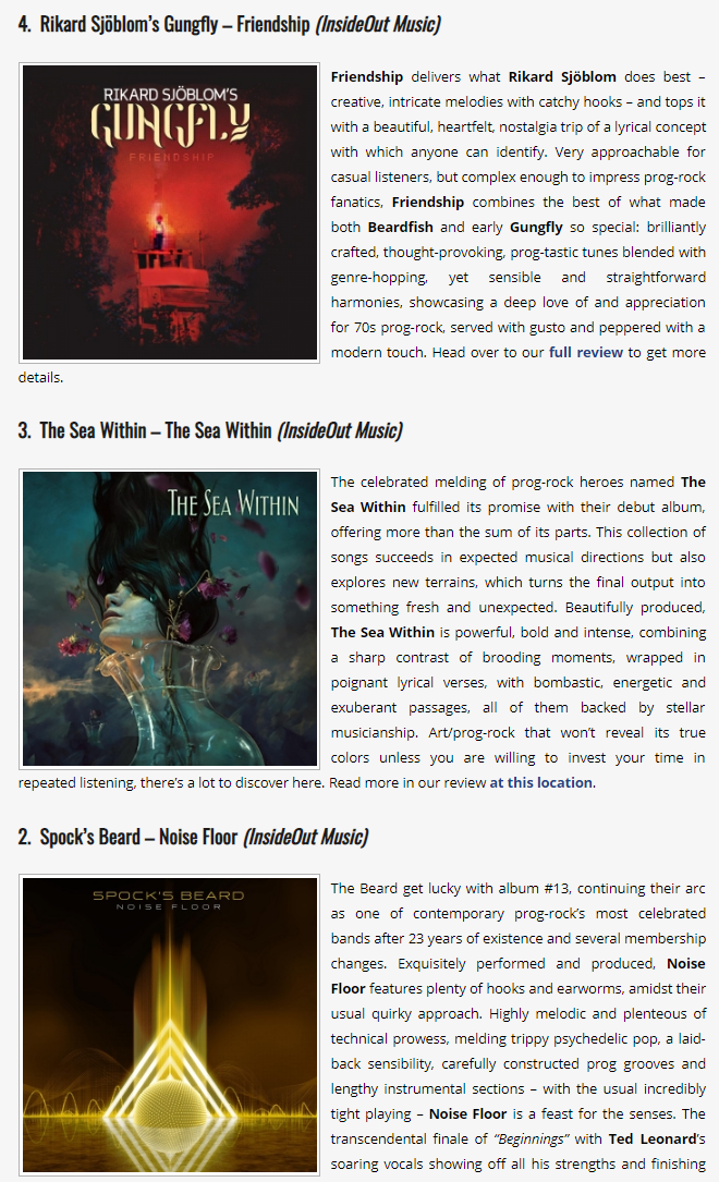 1. Monobody — Raytracing 2. Troot — Constance and the Waiting 3. Ankh — Tu jest i tam jest 4. Finally George — Life is a Killer 5. The Sea Within — The Sea Within 6. Roine Stolt's The Flower Kings — Manifesto of an Alchemist 7. Riverside — Wasteland/The Pineapple Thief — Dissolution 8. NOA — If Tomorrow Comes 9. Pymlico — Nightscape 10. Pepe Maina — Res Obscura honorable mentions: Jean Chaumont — The Beauty of Differences Jimi Hendrix — Both Sides of the Sky Strangefish — The Spotlight Effect Osada Vida — Variomatic Ske — 1001 Autunni still difficult to narrow it all down |