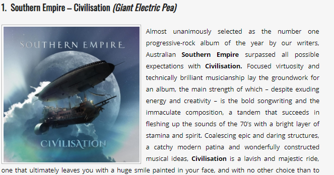 1 - The Tangent - Proxy 2 - Umphrey’s McGee - It's Not Us 3 - The Samurai of Prog - Archiviarum 4 - Spock’s Beard - Noise Floor 5 - Glass Hammer - Chronomonaut 6 - Roine Stolt's The Flower King - Manifesto Of An Alchemist 7 - Regal Worm - Pig Views 8 - 3RDegree - Ones & Zeros 9 - Visual Cliff - Refuge 10- Progeland - Harmony Of The Universe |