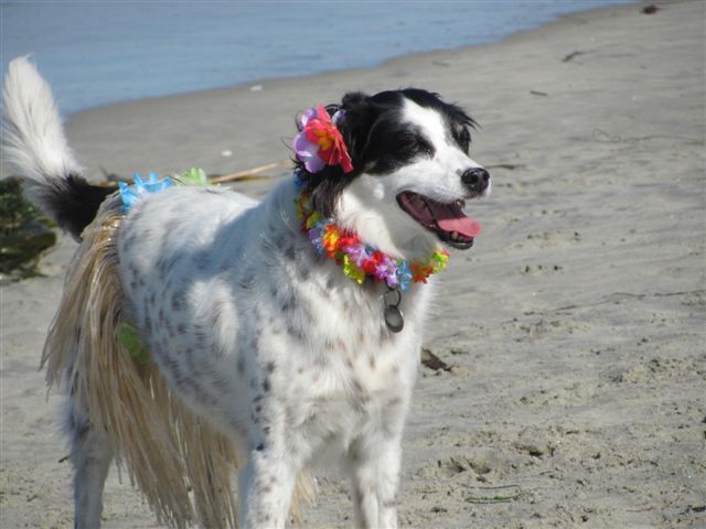 Nice looking dog, but if there were a thought bubble over her head, it would say, "Why the frak am I wearing a this Hawaiian mess? I'm a dog."